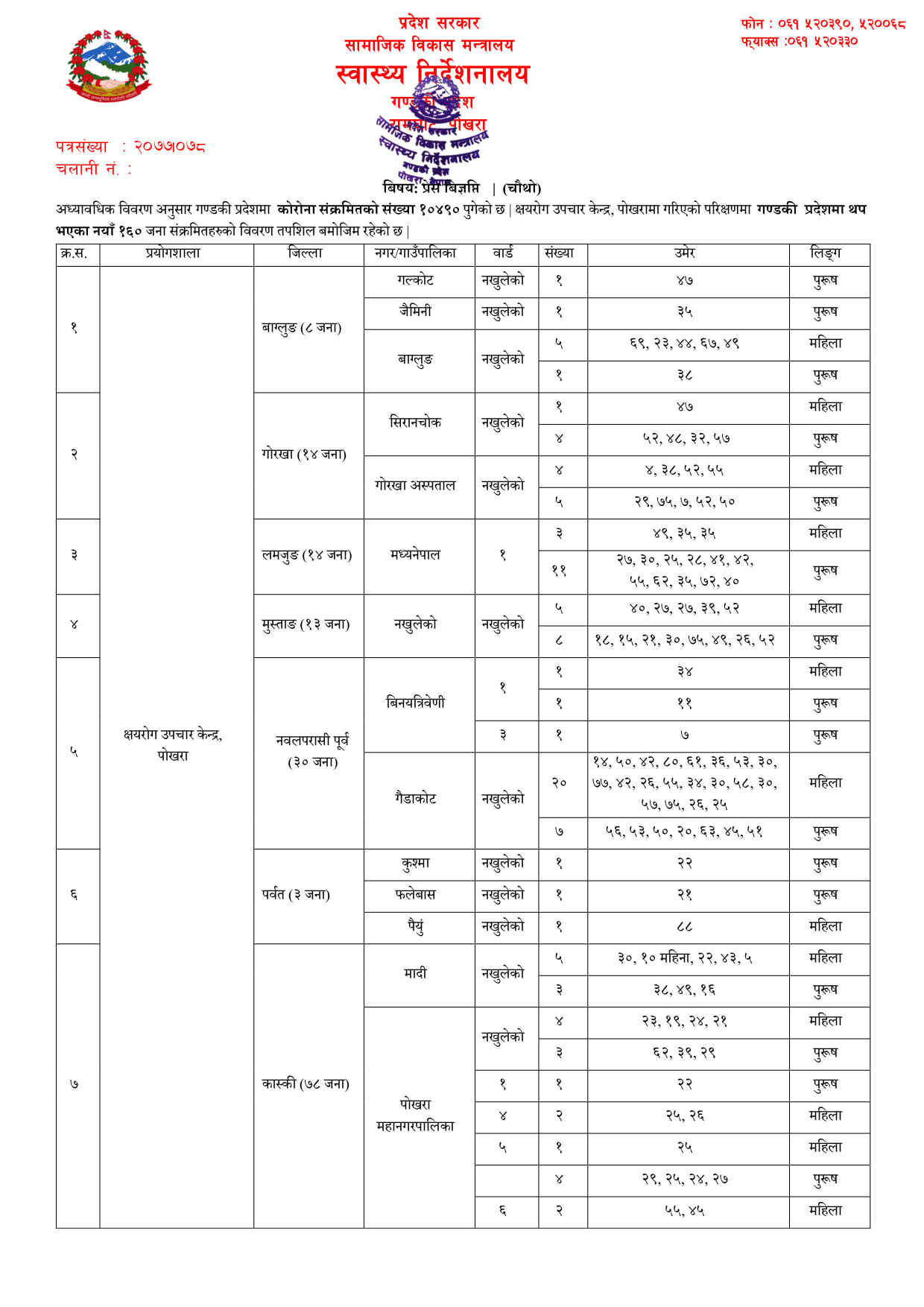 क्षयरोग उपचार केन्द्रमा गरिएको परीक्षणमा कोरोना संक्रमण पुष्टि भएको छ । यसअघि ३२ जना नयाँ कोरोना भाइरसका संmक्रमित थपिए थिए । स्वास्थ्य निर्देशनालय गण्डकीले आइतबार दिउसो जारी गरेको पहिलो ,दोश्रो, तेश्रो विज्ञप्ति अनुसार पोखराका ३२ र नवलपुरका ६, तनहुँका ३ जना सहित ४५ जना थपिएका हुन । गण्डकी प्रदेशमा कोरोना संक्रमितको संख्या १०३३० पुगेको छ । लाइफ केयर डाइग्नोसटिक प्रयोगशाला, पोखरा गरिएको परिक्षणमा गण्डकी प्रदेशर र चितवन मेडिकल कजेजमा गरी नयाँ २९ जनामा संक्रमण पुष्टि भएको हो ।