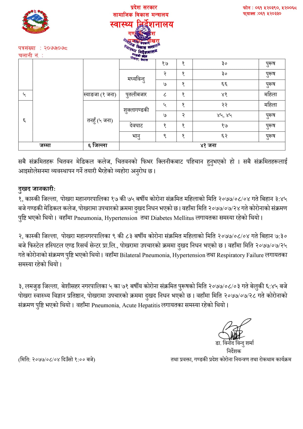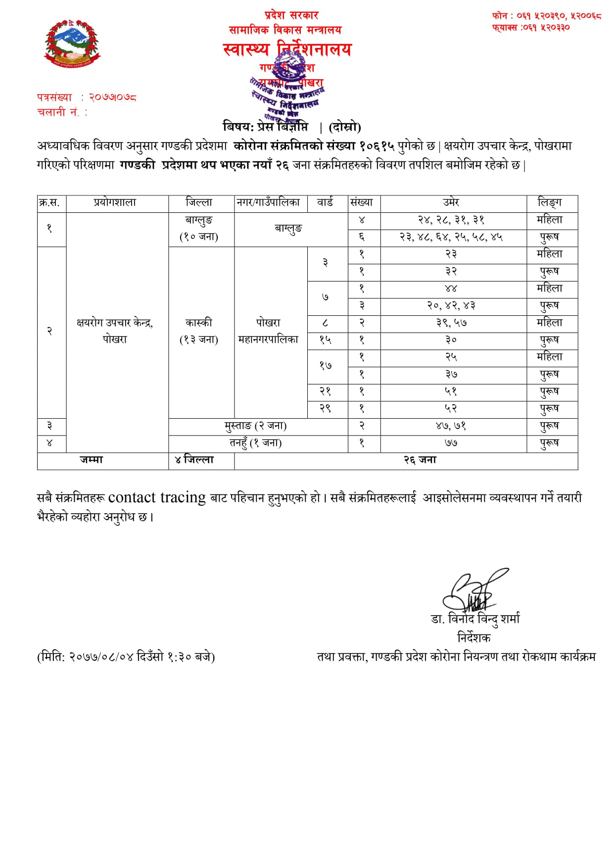 स्वास्थ्य निर्देशनलाय गण्डकीले बिहिबार दिउसो दुई विज्ञप्ति जारी गरी नयाँ संक्रमित थपिएको जनाएको छ । पहिलो विज्ञप्तिमा ६ जिल्लाका ४१ जना र दोश्रो विज्ञप्तिमा ४ जिल्लाका २६ जनामा कोरोना संक्रमण पुष्टि भएको जनाएको छ ।