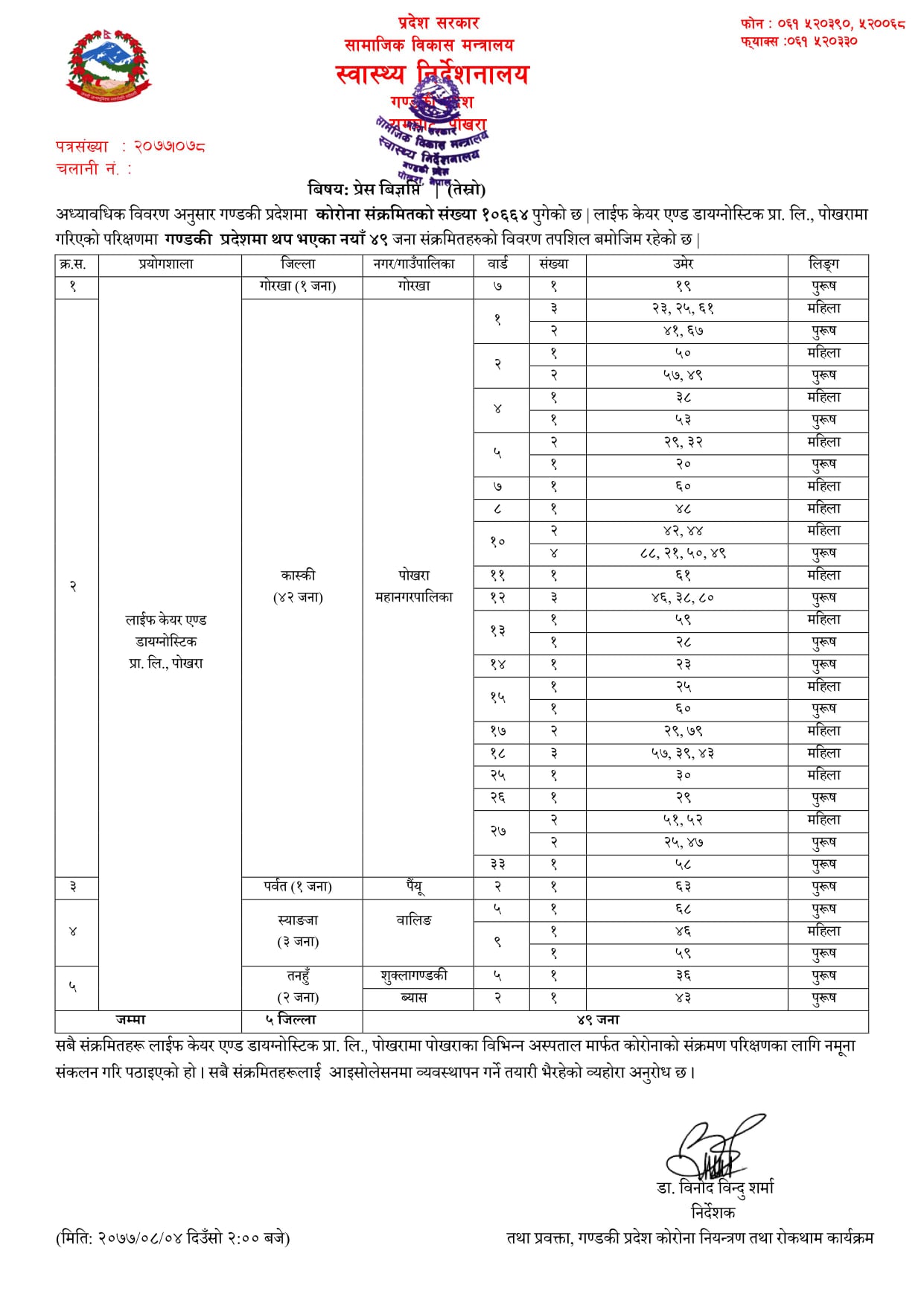 स्वास्थ्य निर्देशनलाय गण्डकीले बिहिबार दिउसो तीन विज्ञप्ति जारी गरी नयाँ संक्रमितको संख्या सार्वजनीक गरेको हो । सार्वजनीक गरेका तीन विज्ञप्ति अनुसार पोखरा महानगरपालिकाका मात्रै ५५ जना रहेका छन् ।