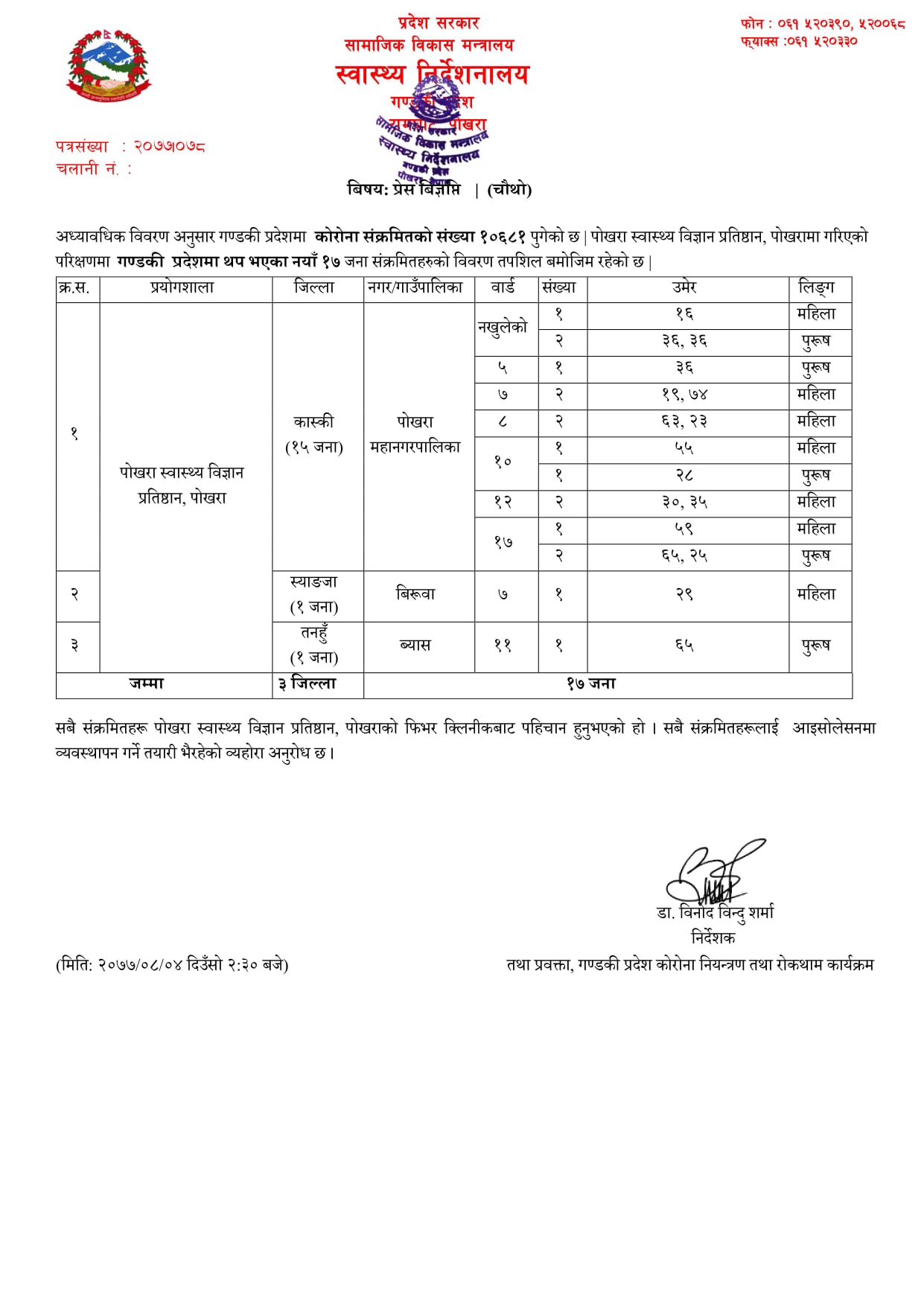 स्वास्थ्य निर्देशनलाय गण्डकीले बिहिबार दिउसो चार विज्ञप्ति जारी गरी नयाँ संक्रमितको संख्या सार्वजनीक गरेको हो । सार्वजनीक गरेका चार विज्ञप्ति अनुसार पोखरा महानगरपालिकाका मात्रै ७० जना रहेका छन् ।