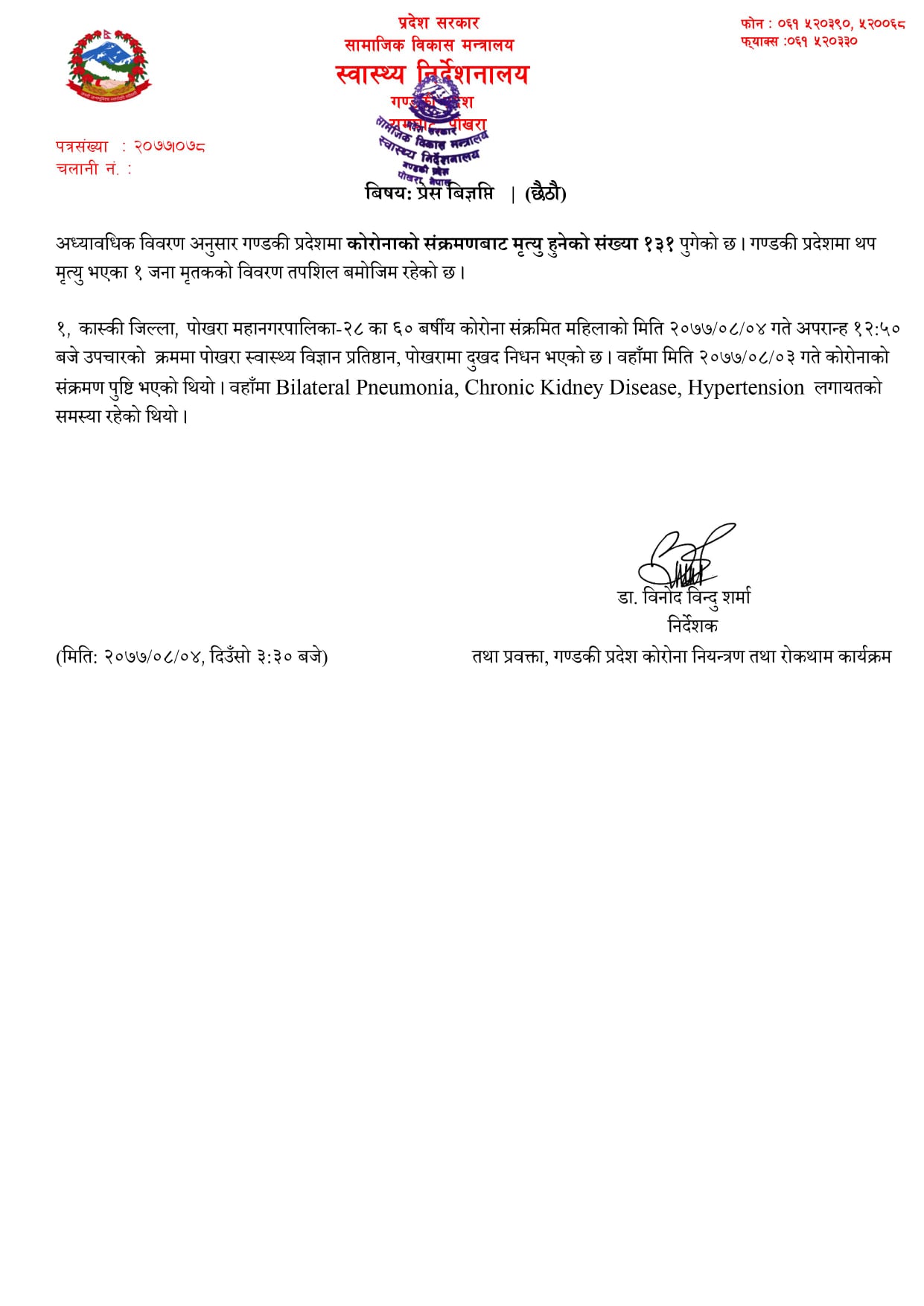 पोखरा महानगरपालिका वडा नम्वर ९ की ८३ वषीय महिलाको फिष्टेल हस्पिटल एण्ड रिसर्च सेन्टरमा उपचारका क्रममा मृत्यु भएको हो ।गत कात्तिक २५ गते कोरोना संक्रमण पुष्टि भएको थियो । त्यस्तै पोखरा २८ की ६० वषीय महिलाको मृत्यु भएको छ । आज अपरान्ह १२ः५० बजे पोखरा स्वास्थ्य विज्ञान प्रतिष्ठानमा उपचारका क्रममा मृत्यु भएको हो । भने लमजुङ जिल्ला बेशीसहर नगरपालिका ५ का ७१ वषीय पुरुषको मृत्यु भएको छ । पोखरा स्वास्थ्य विज्ञान प्रतिष्ठानमा चारका क्रममा मृत्यु भएको स्वास्थ्य निर्देशनालय गण्डकी प्रदेशले जनाएको छ ।
