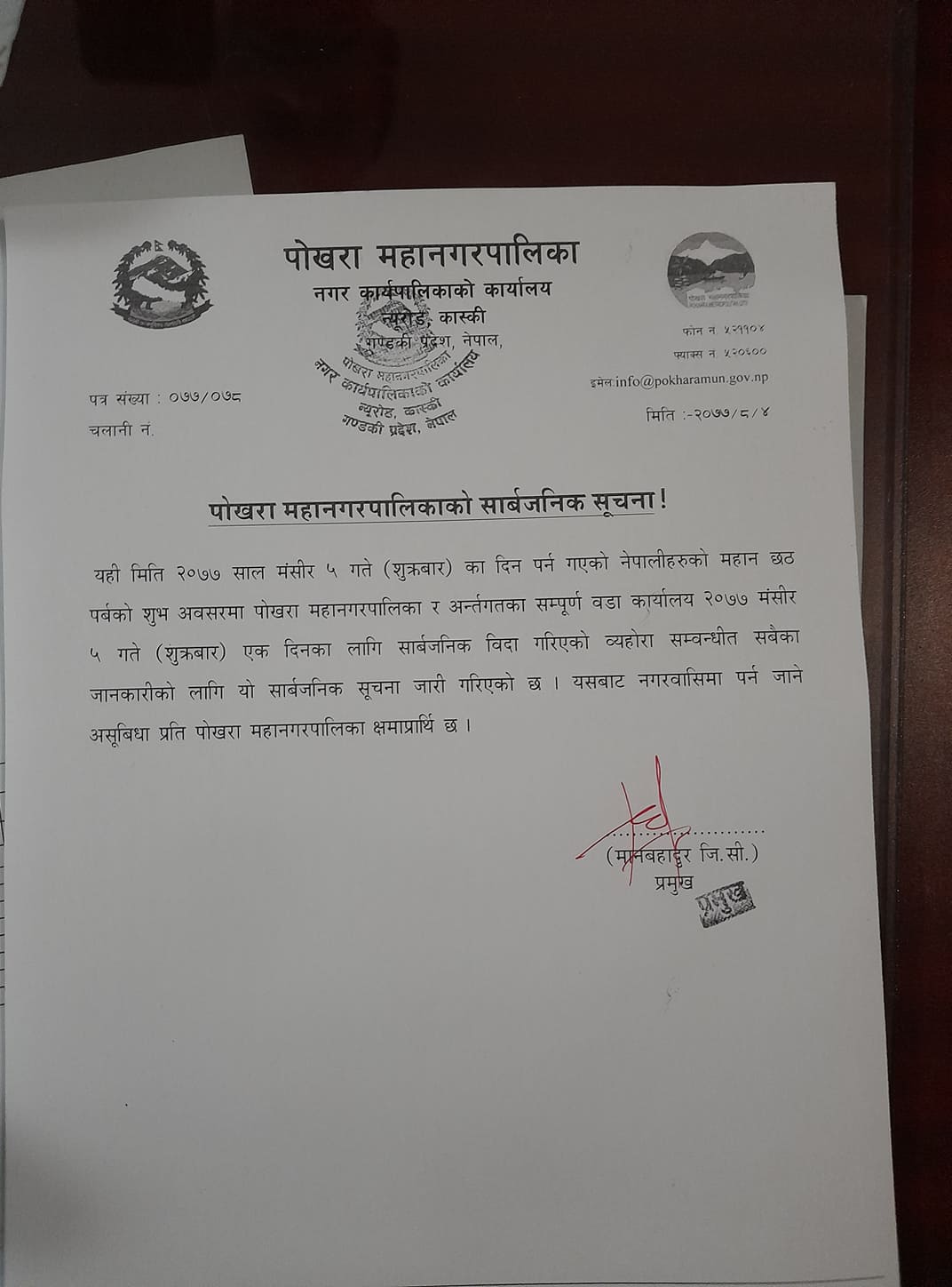शुक्रबार पर्न गएको छठ पर्वको अवसरमा पोखरा महानगरपालिका र वडा कार्यालयहरु  मंसिर पाँच गते एक दिन सर्वाजनीक विदा घोषणा गरिएको छ ।