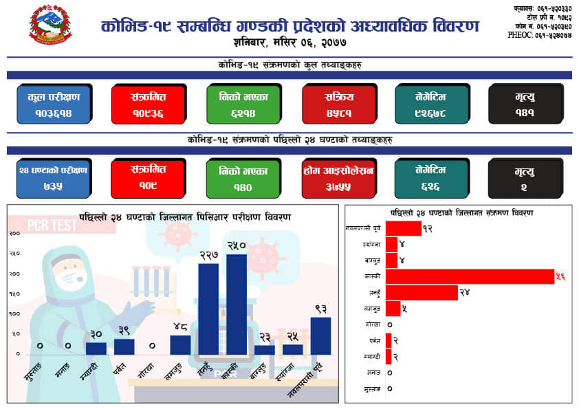 पोखरा, मंसिर ६ गते । गण्डकी प्रदेशमा शनिबार कोरोना भाइरस संक्रमणबाट दुई जनाको मृत्यु भएको छ । मृत्यु हुने मध्य एकजना पोखरा महानगरपालिका र एक जना पर्वत जिल्लाका रहेका छन् । स्वास्थ्य निर्देशनालय गण्डकी प्रदेशले पछिल्लो २४ घण्टाको विवरण सार्वजनीक अनुसार पोखरा १३ का ७९ वषीय पुरुषको कोरोना संक्रमणबाट मृत्यु भएको हो ।