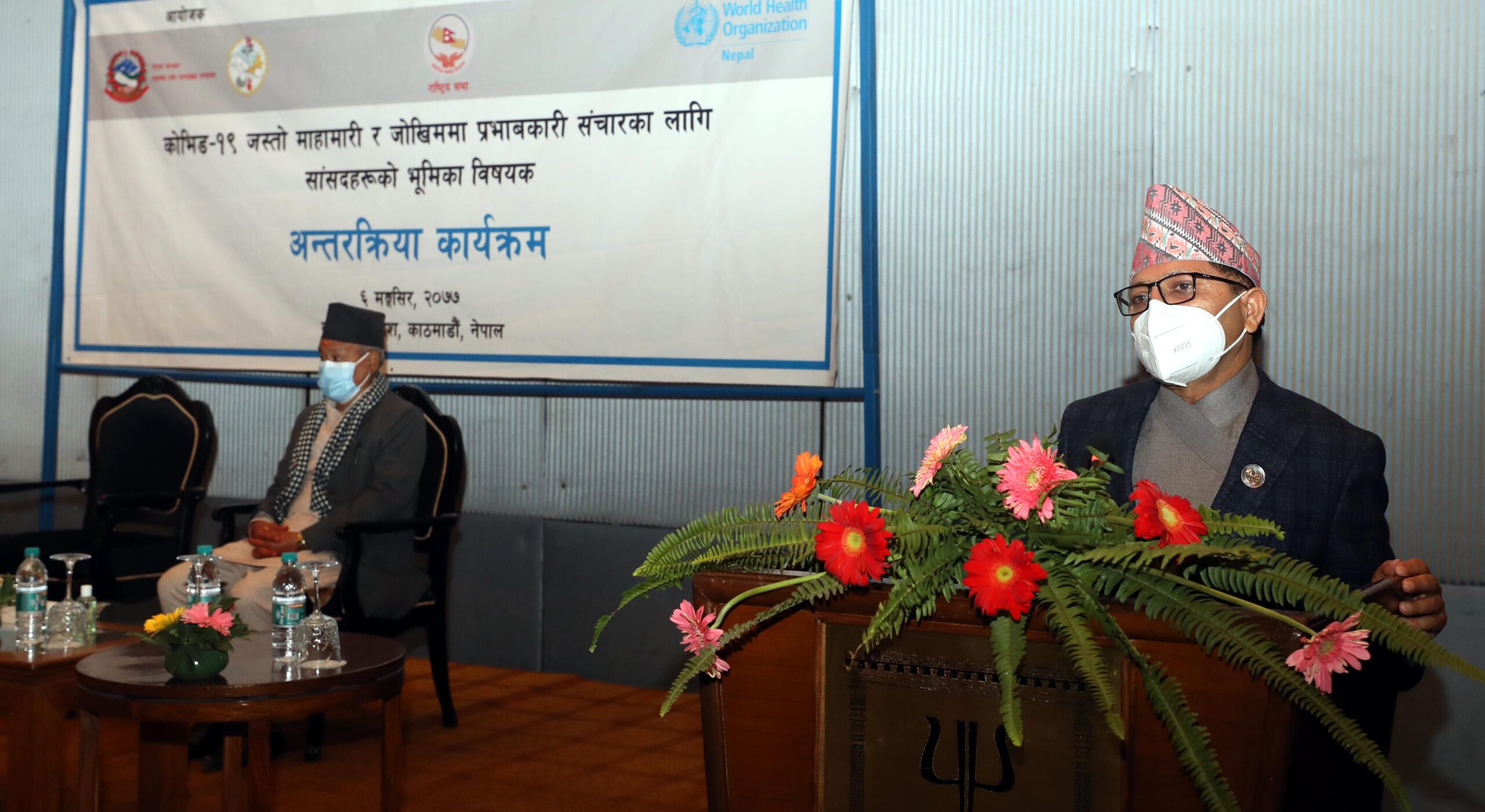 उहाँले संघ, प्रदेशस्तरीय अस्पतालको स्तरउन्नती र सबै स्थानीय तहमा अस्पताल निर्माणको काम अगाडि बढाएको जानकारी दिनुभयो। र्यक्रममा विश्व स्वास्थ्य संगठनका स्वास्थ्य विज्ञ डाक्टर विनोदप्रसाद गुप्ताले कोभिड-१९ पछाडिको विज्ञान बारे सांसदहरू बीच प्रस्तुतिकरण गर्नुभएको थियो।