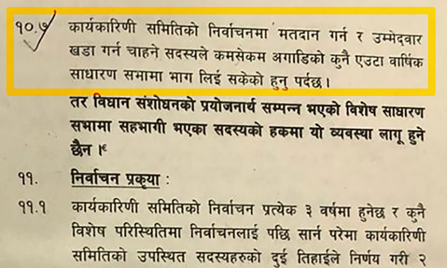महासंघको विधानको दफा ४६ को उपदफा ३ को (क) (ऊ) मा ‘कार्यकारिणी समितिमा सदस्य हुनका लागि सदस्य संघबाट आफुले प्रतिनिधित्व गर्ने संघको पदाधिकारी भई एक कार्यकाल पुरा गरेका’े हुनु पर्ने उल्लेख छ ।