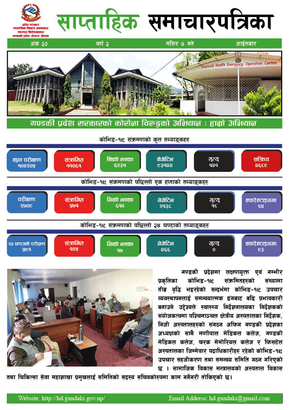 पोखरा, मंसिर ८ गते । गण्डकी प्रदेशमा कोरोना संक्रमितको संख्या बढदो छ । पछिल्लो एक सातामा ५७१ नयाँ संक्रमित थपिएका छन् । गण्डकी प्रदेशमा दशै र तिहारपछि संक्रमितको संख्या ह्वात्तै बढेको देखिन्छ ।