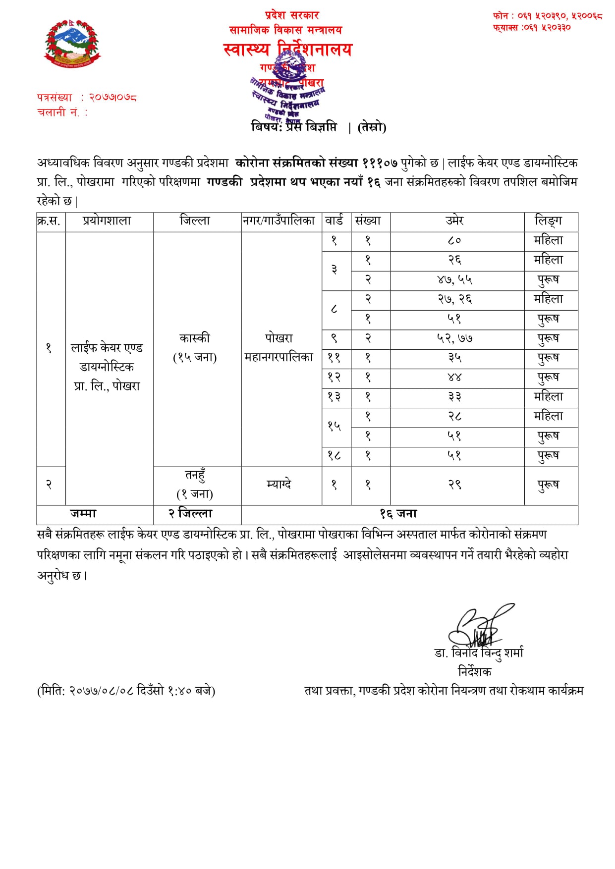 पहिलो विज्ञप्तिमा पोखराका १५ जना, दोश्रो विज्ञप्तिमा १५ जना र तेश्रोमा १६ जना गरी ४६ जना थपिएका हुन् । थपिएका मध्य सवैभन्दा धेरै २८ जना पोखरा महानगरपालिका रहेका छन् । योसंगै गण्डकीमा १११०७ संmक्रमित पुगेका छन् ।