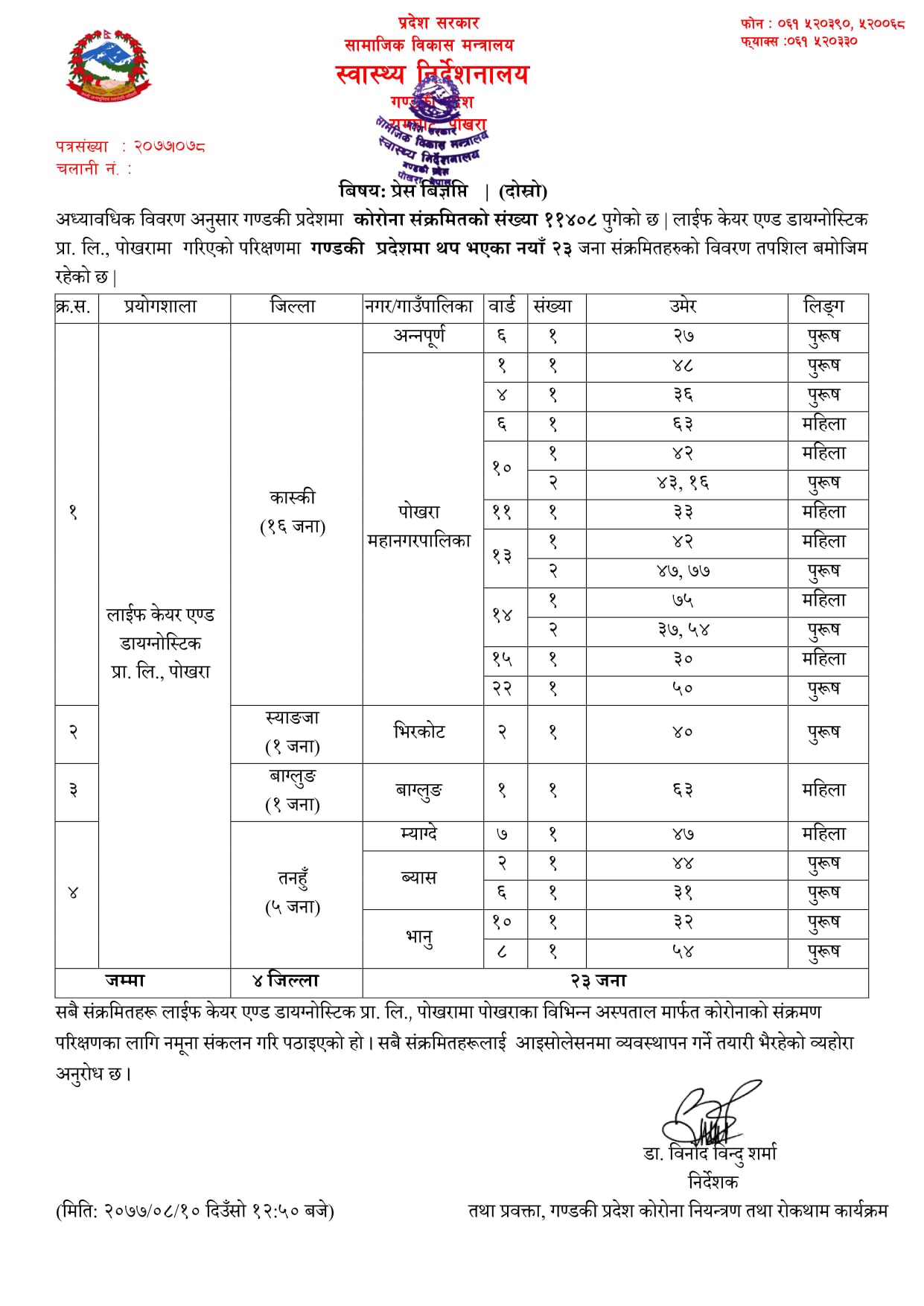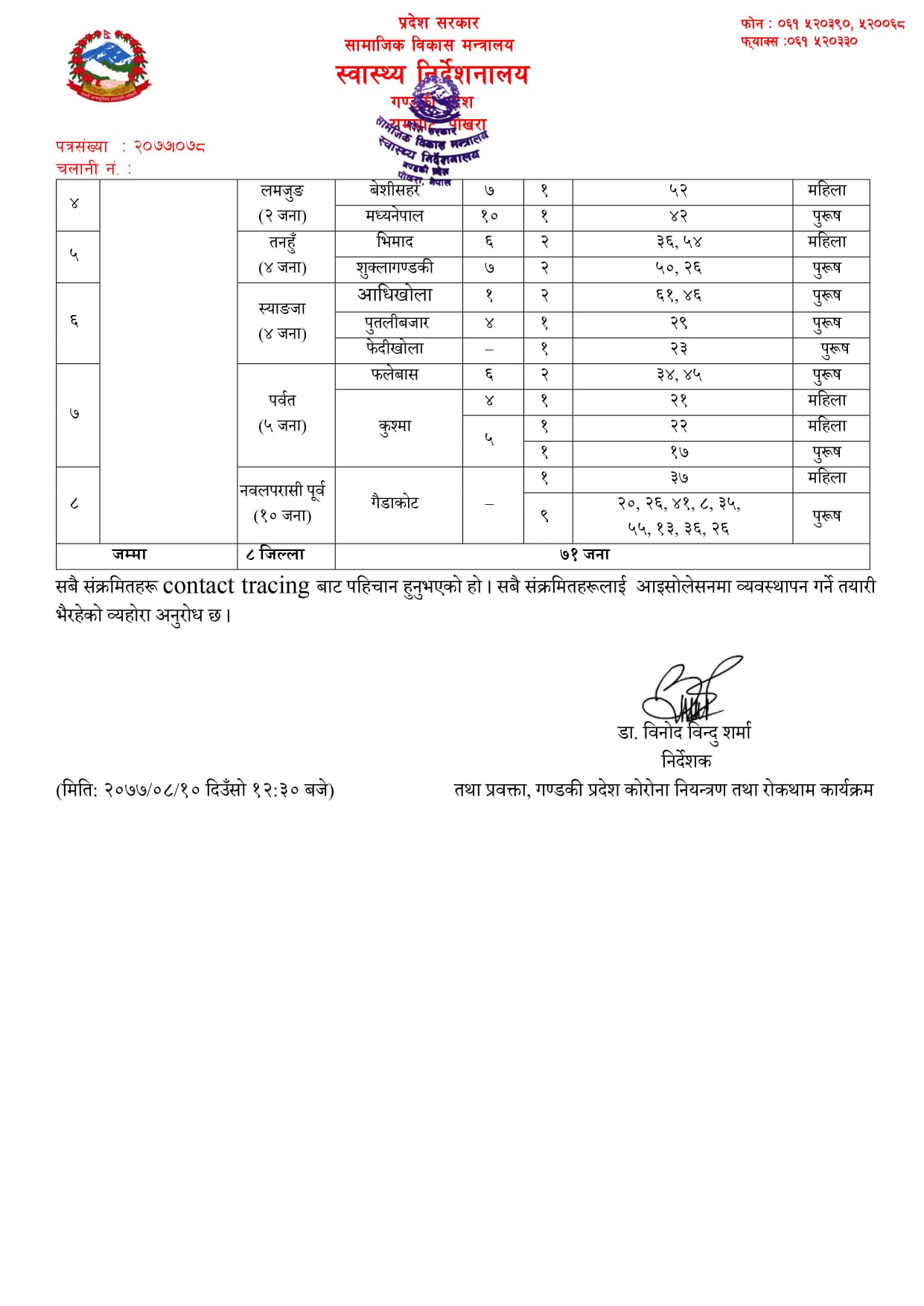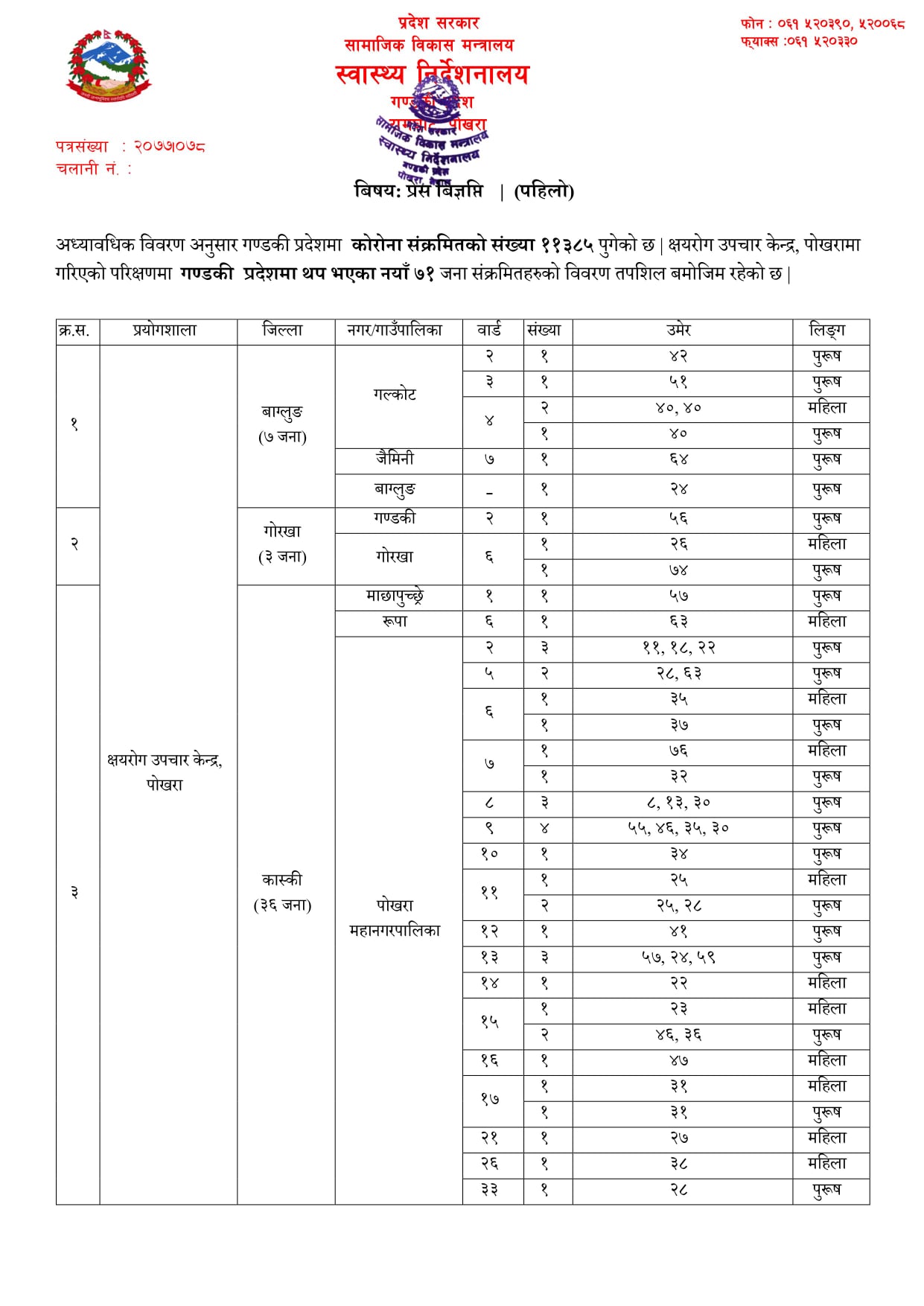 स्वास्थ्य निर्देशनालयले बुधबार दिउसो जारी गरेका छ विज्ञप्ति अनुसार पोखराका ६७ जना सहित १६५ संक्रमित थपिएका हुन् । गण्डकीका ११ जिल्ला मध्य नपवरासीमा ६३ जना, तनहुँमा ११ जना, पर्वतमा ५ जना, बाग्लुङमा ८ जना, लम्जुङमा २ जना र स्याङजामा २ जना र गोरखामा ३ जना नयाँ संक्रमित थपिएका छन् ।