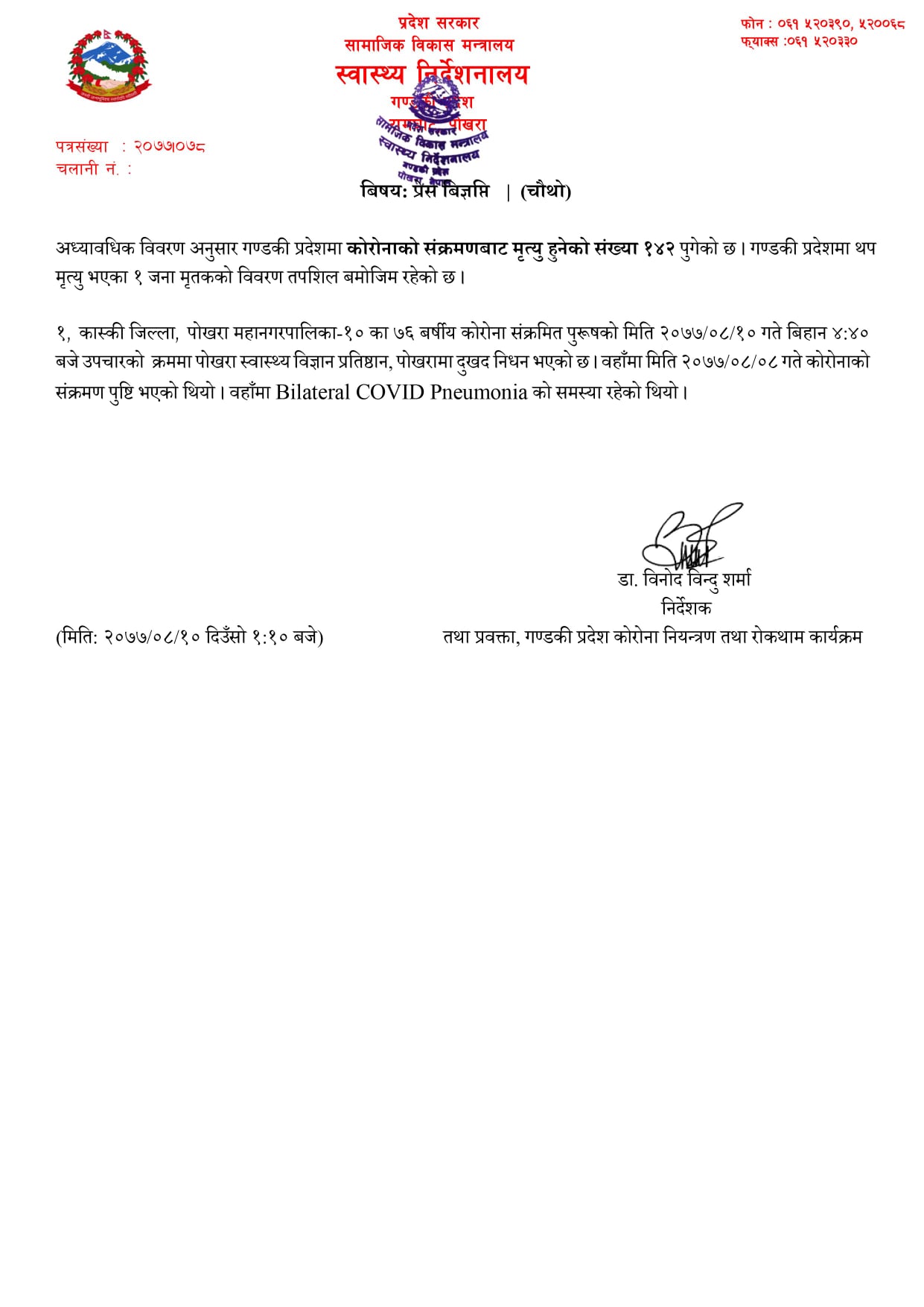 आज विहान ४ः४० बजे पोखरा स्वास्थ्य विज्ञान प्रतिष्ठानमा उपचारका क्रममा मृत्यु भएको स्वास्थ्य निर्देशनालय गण्डकीले जनाएको छ । उहाँलाई सोमबार कोरोना संक्रमण पुष्टि भएको थियो । त्यस्तै गण्डकी प्रदेशमा १६५ नयाँ कोरोना संक्रमित थपिएका छन् ।