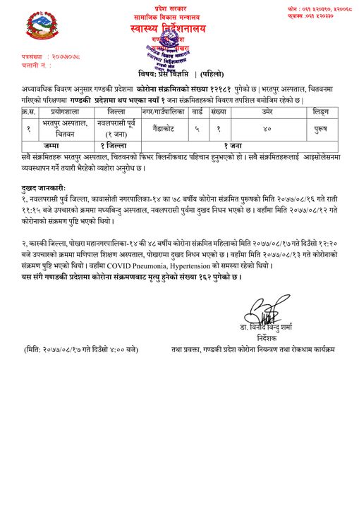 मृत्यु हुनेमा पोखरा महानगरका १४ का ४८ बर्षीया महिला र अर्को कावासोती नगरपालिका १४ का ७८ बर्षीय पुरुष रहेको निर्देशनालयले जनाएको छ ।कावासोतीका पुरुषको मध्यविन्दु अस्पताल नवलपरासी र पोखराकी महिलाको मणिपाल शिक्षण अस्पतालमा उपचारका क्रममा निधन भएको हो । कोरोना संक्रमणबाट मृत्यु हुनेको संख्या १६२ पुगेको छ ।