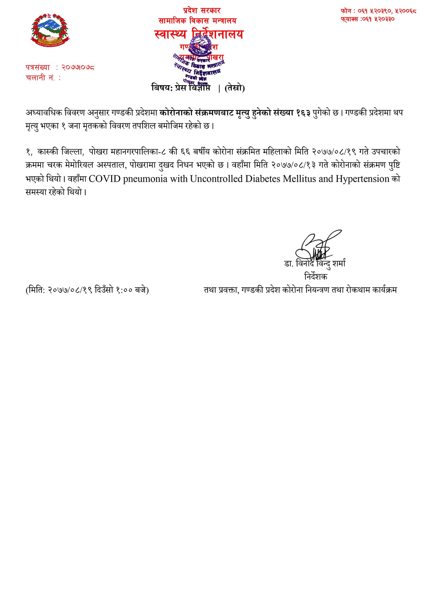 स्वास्थ्य निर्देशनालय गण्डकीले जारी गरेका विज्ञप्ति अनुसार पोखरा महानगरपालिका वडा नम्वर ८ की ६६ बर्षीय महिलाको मृत्यु भएको हो । उपचारका क्रममा शुक्रबार चरक मेमोरियल अस्पतालमा मृत्यु भएको निर्देशनालयले जाएको छ ।