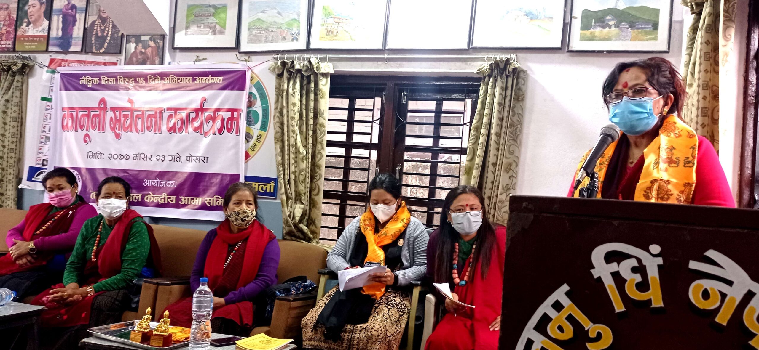 पोखरा, मंसिर २४ गते । लैङ्गिक हिंसा विरुद्धको १६ दिने अभियान अन्र्तगत मंगलवार तमु महिलाहरुलाई लैङ्गिक हिंसा र कानुनी सचेतना कार्यक्रम गरिएको छ।कोभिड १९ कोरोनाको कहर बिचको अवस्थामा पनि आवाश्यक स्वास्थ्य सतर्कताका साथै भौतिक दुरी कायम राख्दै तमु धिं नेपाल केन्द्रिय आमा समितिले तमु महिलाहरुलाई प्रशिक्षित गरिएको हो।