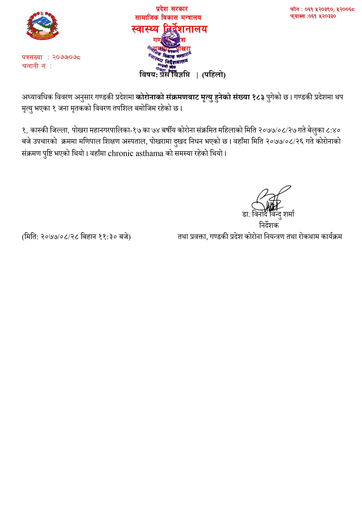 स्वास्थ्य निर्देशनालय गण्डकीका अनुसार पोखरा महानगरपालिका वडा नम्वर १७ का ७४बर्षीय पुरुषको मृत्यु भएको छ।