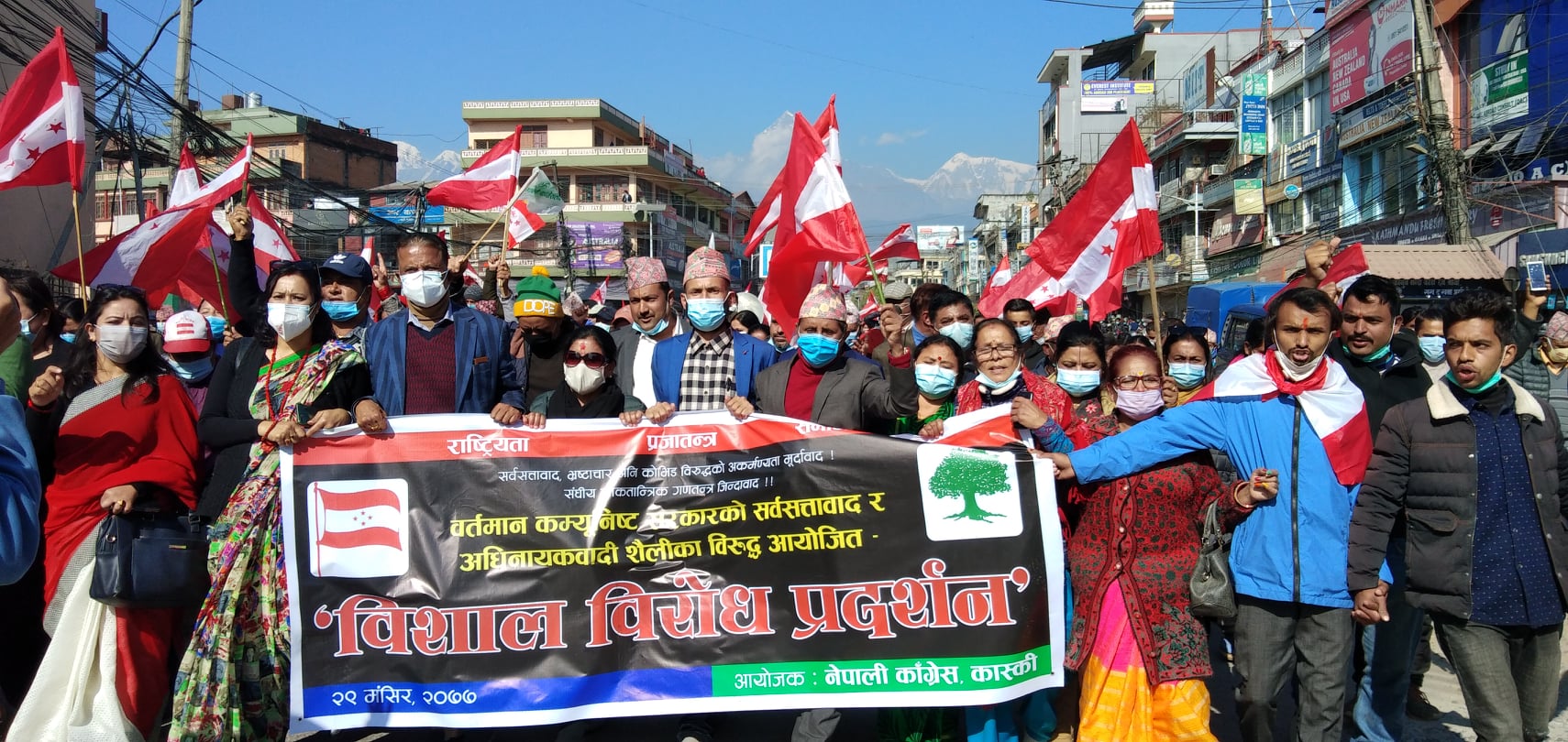 काठमाडौं, मङ्सिर २९ गते । नेपाली काँग्रेसले देशभर प्रर्दशन गरेको छ ।काँग्रेसले सरकारकाविरुद्ध केन्द्रीत हुँदै सोमबार पोखरा सहित देशभर विरोधसभा गरेको हो ।