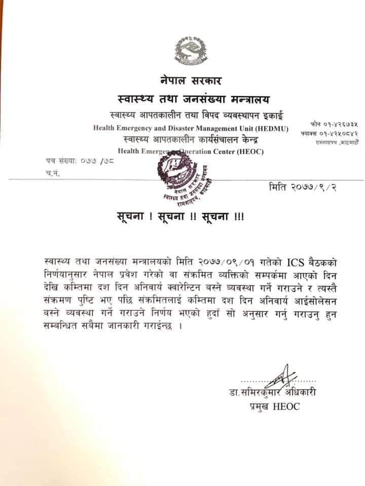 बिहिबार स्वास्थ्य तथा जनसंख्या मन्त्रालयले सुचना जारी गदै संक्रमण पुष्टि भएपछि संक्रमितलाई कम्तिमा दश दिन अनिवार्य आइसोलेसनमा बस्ने व्यवस्था गर्ने निर्णय भएको हुदाँ त्यसको कार्यान्वयन गर्न निर्देशन दिएको हो । मन्त्रालयले कुनै पनि अस्पतालले कोभिड १९ बिरामी भर्ना गरी उपचार गरे वापत शुल्क नमाग्न समेत निर्देशन दिएको छ ।