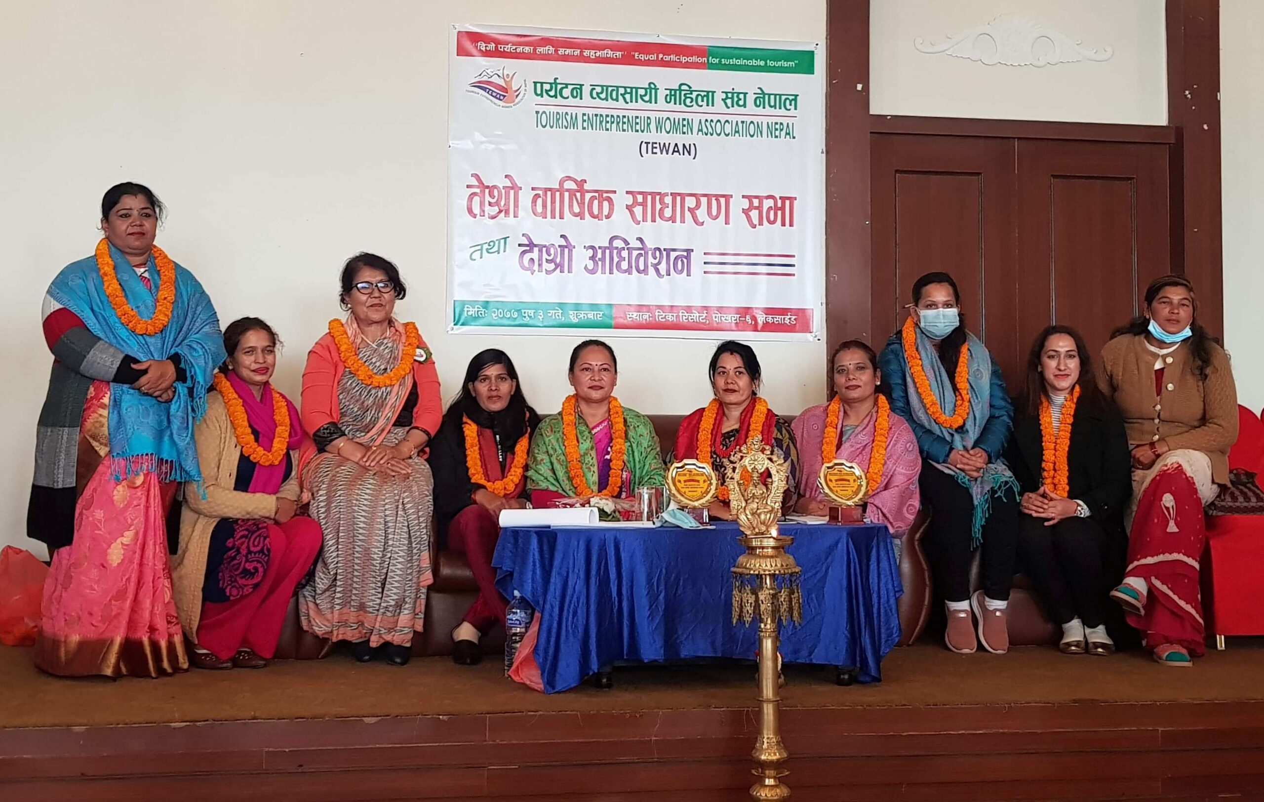 पोखरा, पुस ३ गते । पर्यटन व्यवसायी महिला संघ नेपाल(टेवान)को तेस्रो वार्षिक साधारणसभा एवम् दोस्रो अधिवेशनले रेनु थापाको अध्यक्षतामा नयाँ कार्यसमिति सर्वसम्मत निर्वाचित गरेको छ । संघको उपाध्यक्षमा कमला गिरी, महासचिवमा शोभा पाण्डे, सचिवमा प्रभा सुवेदी र कोषाध्यक्षमा शोभा अधिकारी पौडेल रहनुभएको छ ।