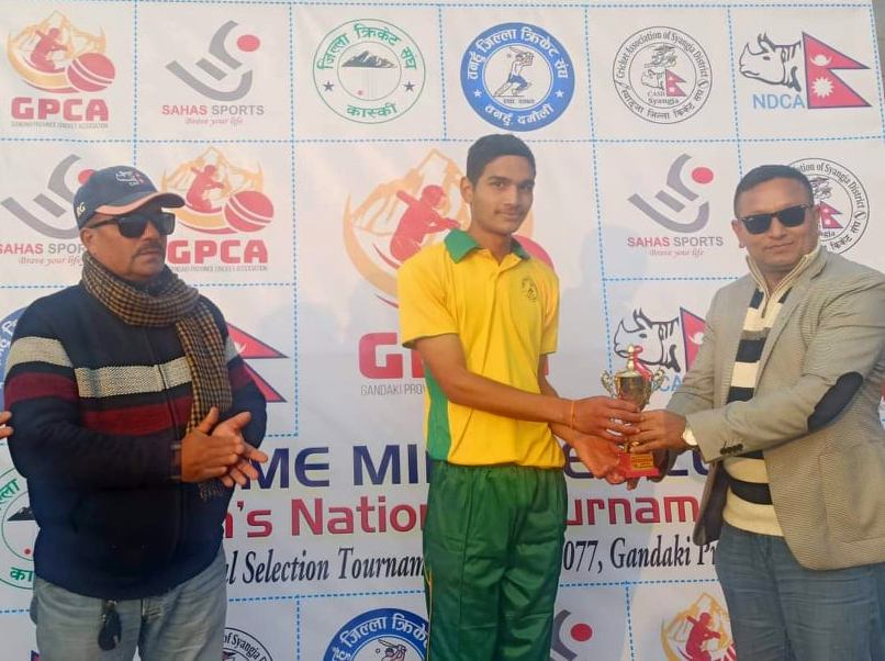 ब्याटिङ्गतर्फ १७ रन तथा बलिङ्गतर्फ २ विकेट लिएका तनहुँका करुण सिरमला म्यान अफ द म्याच भए । उनलाई तनुहँ क्रिकेट संघका अध्यक्ष ताराराम श्रेष्ठले म्यान अफ द म्याचको ट्रफि प्रदान गरेका थिए । प्रतियोगिगतामा आइतबार नवलपुर र तनहुँ भिड्नेछन् ।
