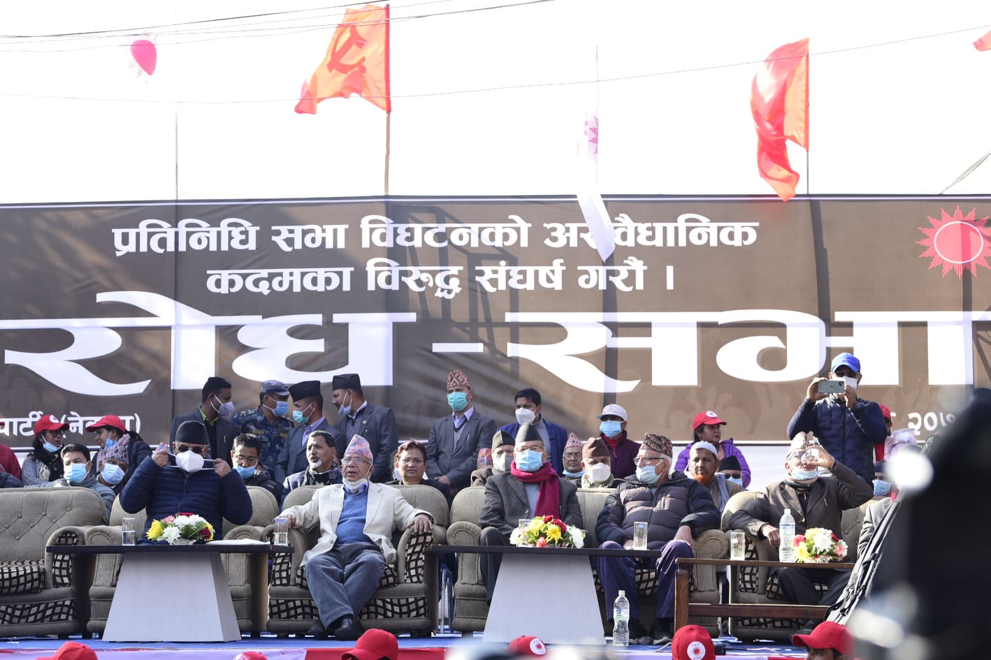 वरिष्ठ नेता झलनाथ खनालले मुलुकलाई समाजवादमा लग्ने पार्टीको पार्टीको नीति विर्सेर एकलौटी ढङ्गले काम गरेको टिप्पणी गर्नुभयो ।विराेधसभाअघि काठमाडौंको विभिन्न चोकबाट सो पक्षको कार्यकर्ताको र्याली प्रदर्शन गरिएको थियो । प्रदर्शनीमार्गस्थित प्रदर्शनीमार्गमा गएर विराेधसभामा परिणत भएको थियो ।