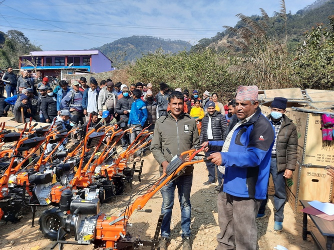 किसानलाई खेती गर्न सहज होस् भनेर अनुदानमा हाते ट्याक्टर प्रदान गरिएको गाउँपालिका अध्यक्ष सुधिर कुमार पौडेलले बताए । ‘गाउँमा गोरु पाल्ने चलन हराइ सक्यो । काम गर्ने मान्छे पनि छैनन्,’ उनले भने, ‘कृषि सरल र सहज बनाउन किसानलाई ट्याक्टर दिएका हौं ।’ कृषिमा यान्त्रीकरण, व्यवसायीकरण र बजारीकरण गर्नुपर्ने भन्दै यसका लागि किसानलाई सहयोग गरिएको अध्यक्ष पौडेलले बताए ।