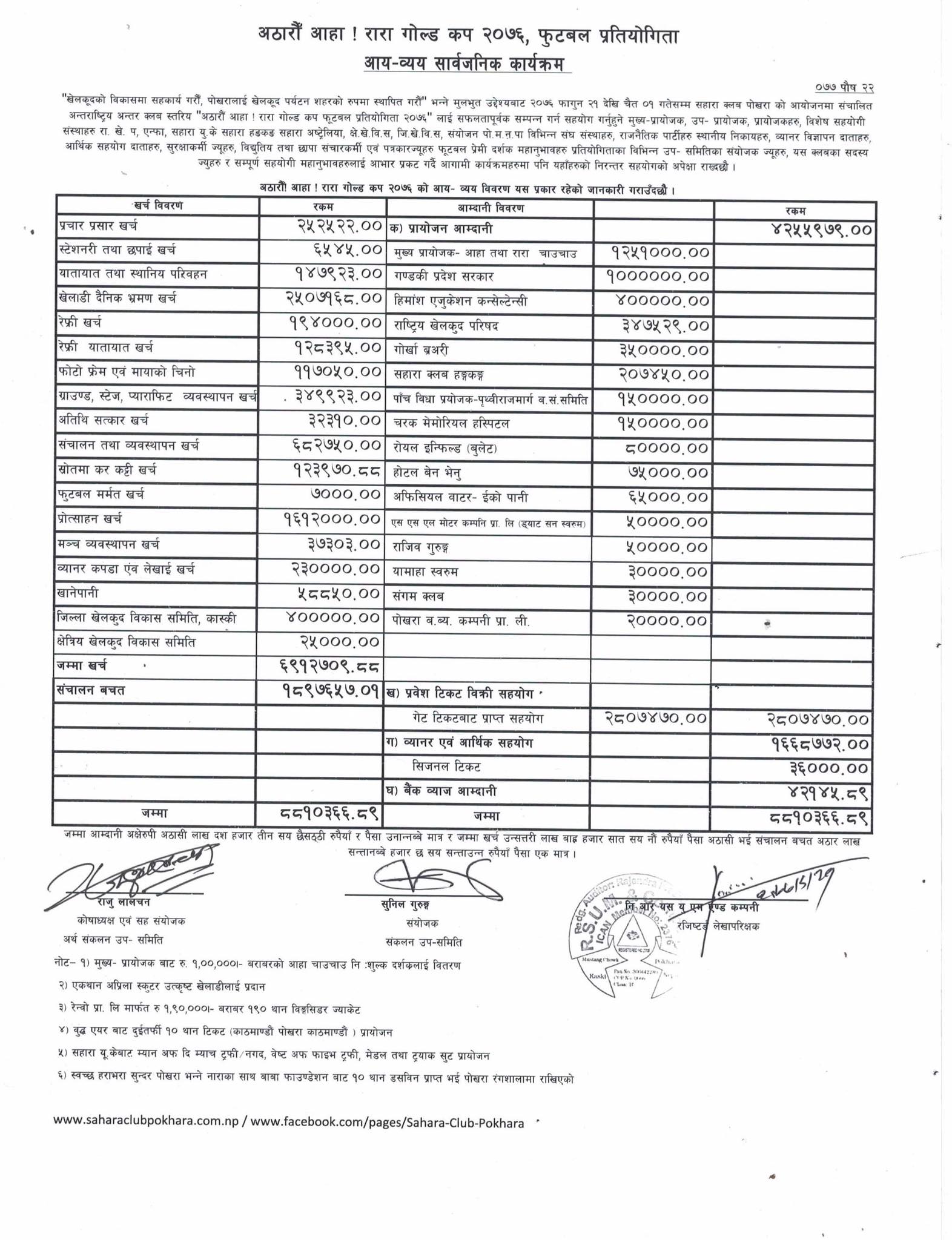 त्यसै गरी व्यानर तथा आर्थिक सहयोगबाट १६ लाख ६८ हजार ७ सय ७२, सिजनल टिकटबाट ३६ हजार, बैंक व्याज आम्दनीबाट ४२ जहार १ सय ४५ रुपैया आम्दानी भएको उनले जनाए । मुख्य प्रायोजक आहा तथा रारा तयारी चाउचाउबाट १२ लाख ५१ ह्जार, गण्डकी प्रदेश सरकारबाट १० लाख, हिमांश एजुकेशन कन्सेल्टेनसीबाट ४ लाख, राखेपबाट ३ लाख ४७ हजार ५ सय २९, गोर्खा ब्रअरीबाट ३ लाख ५० हजार, सहारा क्लव हङकङबाट २ लाख ७ हजार ४ सय ५० रुपैया लगायतका संघ संस्थाबाट सहयोग प्राप्त भएको क्लवले जनाएको छ ।