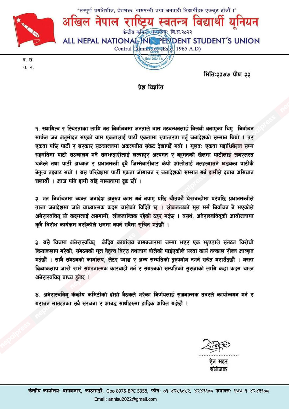 संयोजक ऐन महरले बुधबार विज्ञप्ति जारी गर्दै संगनठको सम्पति जोगाउन कडा कदम चाल्न बाध्य हुने चेतावनी दिएका छन् ।‘यसैबीचमा अनेरास्ववीयू केन्द्रीय कार्यालय बागबजारमा जम्मा भएर एक झुण्डले संगठन विरोधी क्रियाकलाप गरेको, संगठनको मुल नेतृत्वविरुद्ध तथनाम बोलेको पाइएकाले यस्ता कार्य तत्कालन रोक्न आह्वान गर्दछौं,’ विज्ञप्तिमा भनिएको छ, ‘साथै संगठनको कार्यालय, लेटरप्याड र अन्य सम्पतिको दुरुपयोग नगर्न सचेत गराउँदछौं । यस्ता कारबाही जारी राखे संगठनात्मक कारबाही गर्न र संगनको सम्पति सुरक्षाका लागि कडा कदम चाल्न अनेरास्ववियू बाध्य हुने छ।’