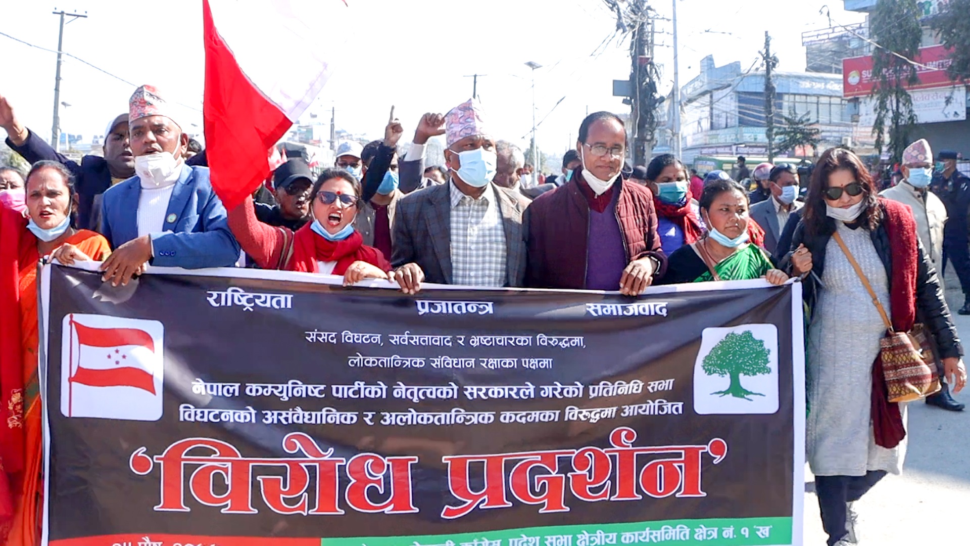 पोखरा, २५ पुस । सरकारले संसद विघटन गरेको विरोधमा नेपाली काँग्रेसले पुस २५ गते शनिवार कास्कीमा पनि प्रदर्शन गरेको छ । कास्कीका ६ वटा प्रदेश सभा क्षेत्रमा प्रदर्शन गरिएको कास्की काँग्रेसका प्रवक्ता नवीन सिग्देलले जानकारी दिए । प्रवक्ता सिग्देलका अनुसार, प्रदेश सभा १ ‘क’ क्षेत्रको तालचोक, १ ‘ख’ क्षेत्रको औधोगिक क्षेत्र, प्रदेश सभा २ ‘क’ को विरौटा, २ ‘ख’ को चिप्लेढुङ्गास्थित नेपाली काँग्रेस कास्कीको पार्टी कार्यालय, प्रदेश सभा ३ ‘क’ को हेमजा मिलन चोक र ३ ‘ख’ को लौरुक र वाम्दीबाट शुरु भएको प्रदर्शन विभिन्न स्थान परिक्रमापछि विरोध सभामा परीणत भएको थियो ।