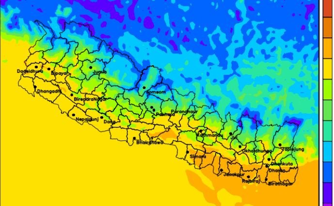 काठमाडौँ, पुस २८ गते । स्थानीय वायुको प्रभावले आगामी तीन दिन देशका अधिकांश स्थानमा आंशिकदेखि सामान्य बदली हुने भएको छ । आगामी बिहीबारसम्म प्रदेश नं १ ,२, वाग्मती र गण्डकी प्रदेशमा आंशिकदेखि सामान्य बदली रही केही स्थानमा हल्कामा वर्षासमेतको सम्भावना छ ।