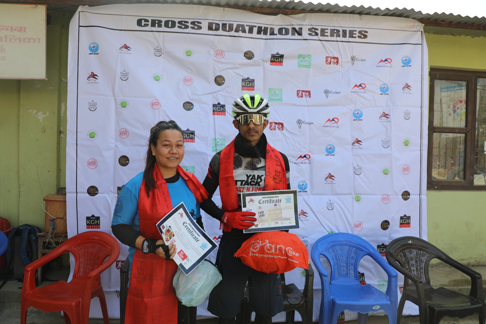 काठमाडौ, माघ १० गते ।अच्युत कृष्ण खरेल र करिशा महर्जन नेपाल ट्राईयाथलन संघ र जम्प नेशनको संयुक्त आयोजनमा भएको क्रस दुवाथलन सिरिजको दोश्रो संस्करणमा बिजयी भएका छन् ।ऐतिहासिक सहर किर्तिपुरको जाखामा भएको च्याम्पियनसिपमा ३७ मिनट २७ सेकेन्डका साथ खरेलले प्रथम स्थान हात पारेका हुन् । उनले जिम्बु थकालीको तर्फबाट प्रदान गरिएको २ हजार बराबरको भौचर र प्याङ्क बाईकको तर्फबाट २ हजार बराबरको फ्रि सर्भिसिङ्ग भौचर प्राप्त गरे ।