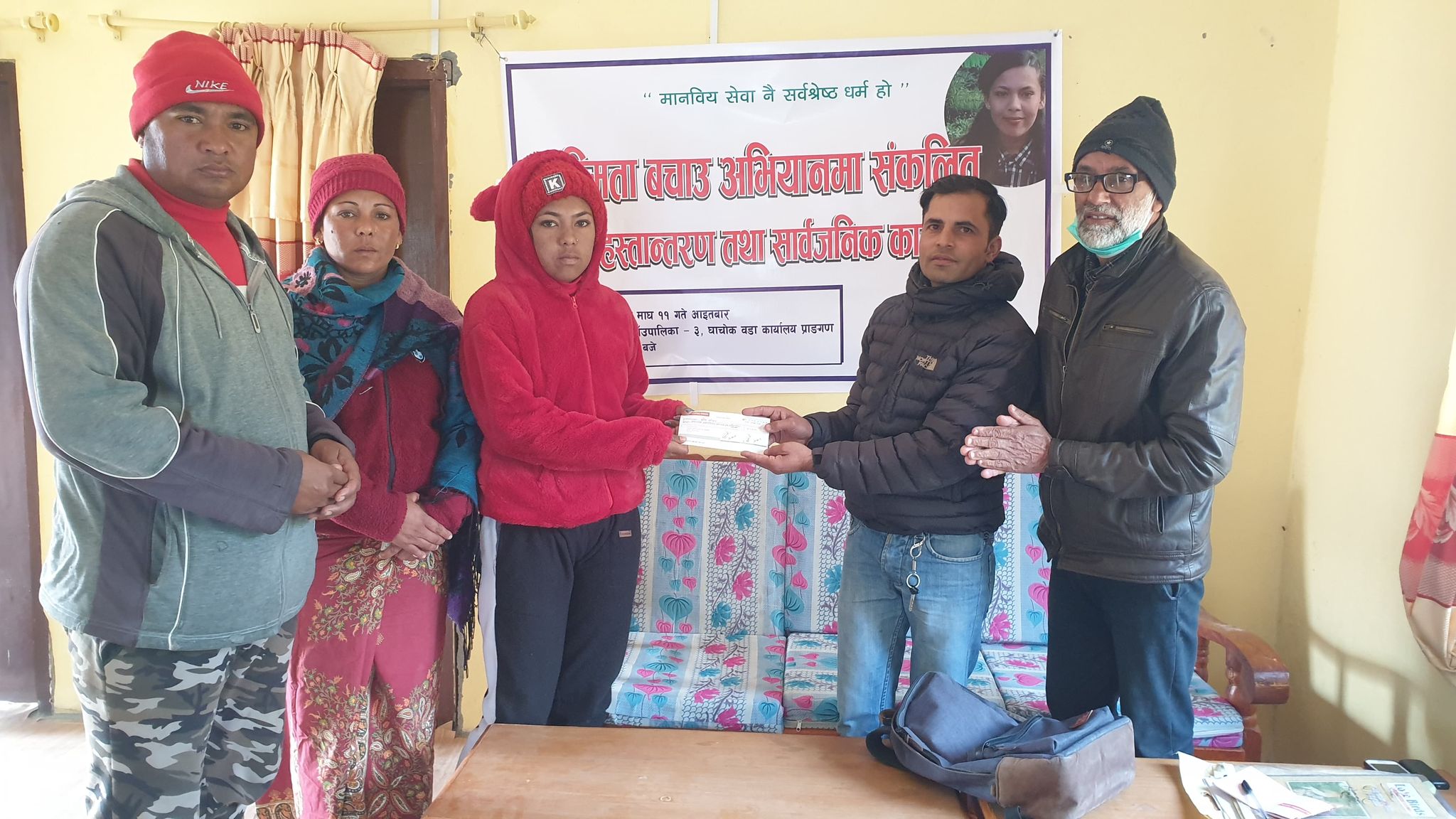 त्यस्तै अभियान समितिद्धारा आइतबार ३ लाख ८८ हजार ७०१ हस्तान्त्रण गरिएको छ । हालसम्म समितिले १३ लाख २१ हजार ६७२ रकम संकलन भएको र अन्य रकम बिगतमा समितिको सहकार्यमा सहयोगि दाताहरुको प्रतक्षय उपस्थितिमा पिडित परिवारलाई हस्तान्त्रण गरिएको संयोजक संजय लमसालले जानकारी दिए । यस अभियानमा हाल जापानमा रहेका जी।एम रानाभाटको मुख्य भुमिका रहेको समेत उनले उल्लेख गरे ।