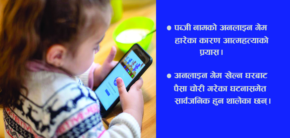त्यस्तै रुपन्देहीमा ‘पब्जी’ नामको अनलाइन गेम हारेका कारण आत्महत्याको प्रयास गरिरहेका एक बालकको नेपाल प्रहरीको साइबर ब्युरोले उद्धार गरेको छ । कार्टुन तथा ज्ञान दिने ‘एप्स’ र वेभसाइट भन्दा बालबालिकामा अनलाइन गेमप्रतिको आकर्षण बढी देखिन्छ ।साइबर ब्युरो प्रवक्ता नविन्द अर्यालका अनुसार पब्जी, फ्रि–फायर, क्वाइन मास्टर, ज्याकपट म्याजिक स्लट, मोबाइल ले–जेन्ड्स र ई–फुटबललगायत ‘एप्स’ खेलको लतमा फसेका बालबालिकामा झनक्क झर्किने, रिसाउने र खेलमा भाग लिन रकम चोरीको समस्या बढी देखिन्छ ।