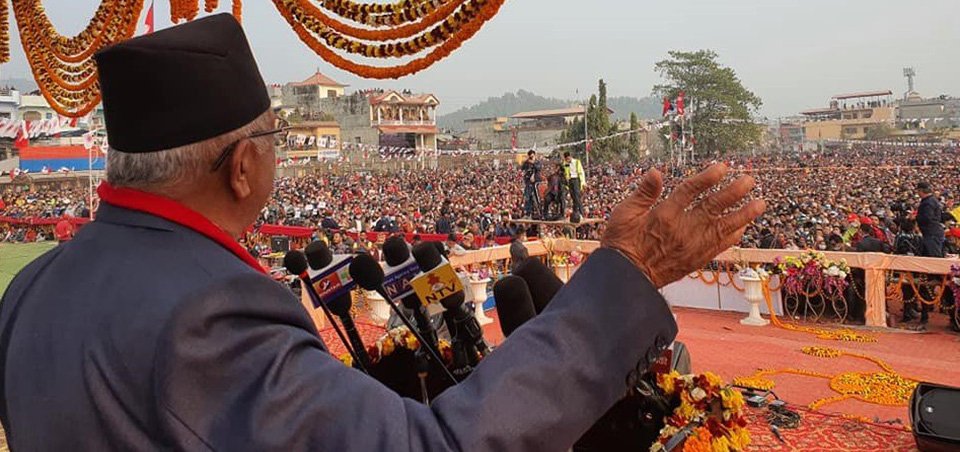काठमाडौं, फागुन १ गते । नेपाल कम्युनिष्ट पार्टी (नेकपा) का अध्यक्ष तथा प्रधानमन्त्री केपी शर्मा ओलीले जनताको बीचमा गएर निर्वाचन गर्नु ‘प्रतिगमन’ नभएको बताउनुहुँदै निर्वाचन भएर छाड्ने प्रष्ट पार्नुभएको छ ।नेकपा लुम्बिनी प्रदेशद्वारा विहिबार बुटवलमा आयोजित जनसभालाई सम्बोधन गर्नुहुँदै उहाँले त्यस्तो बताउनुभयो । देश हैन, आफूलाई बनाउन हिड्ने केही नेताहरु आज सडकमा पुगेको उहाँले बताउनुभयो । “देश बनाउने उद्देश्य नबोकेका तत्वहरु अहिले पार्टी छाडेर बाहिरिएका छन्” उहाँले थप्नुभयो, “चुनाव हुने भनेको कसरी प्रतिगमन ? ताजा जनादेशका लागि जनताबीच जानु कसरी प्रतिगमन ? तपाईहरुले कस्तो व्यवस्था खोज्नुभयो ? ”