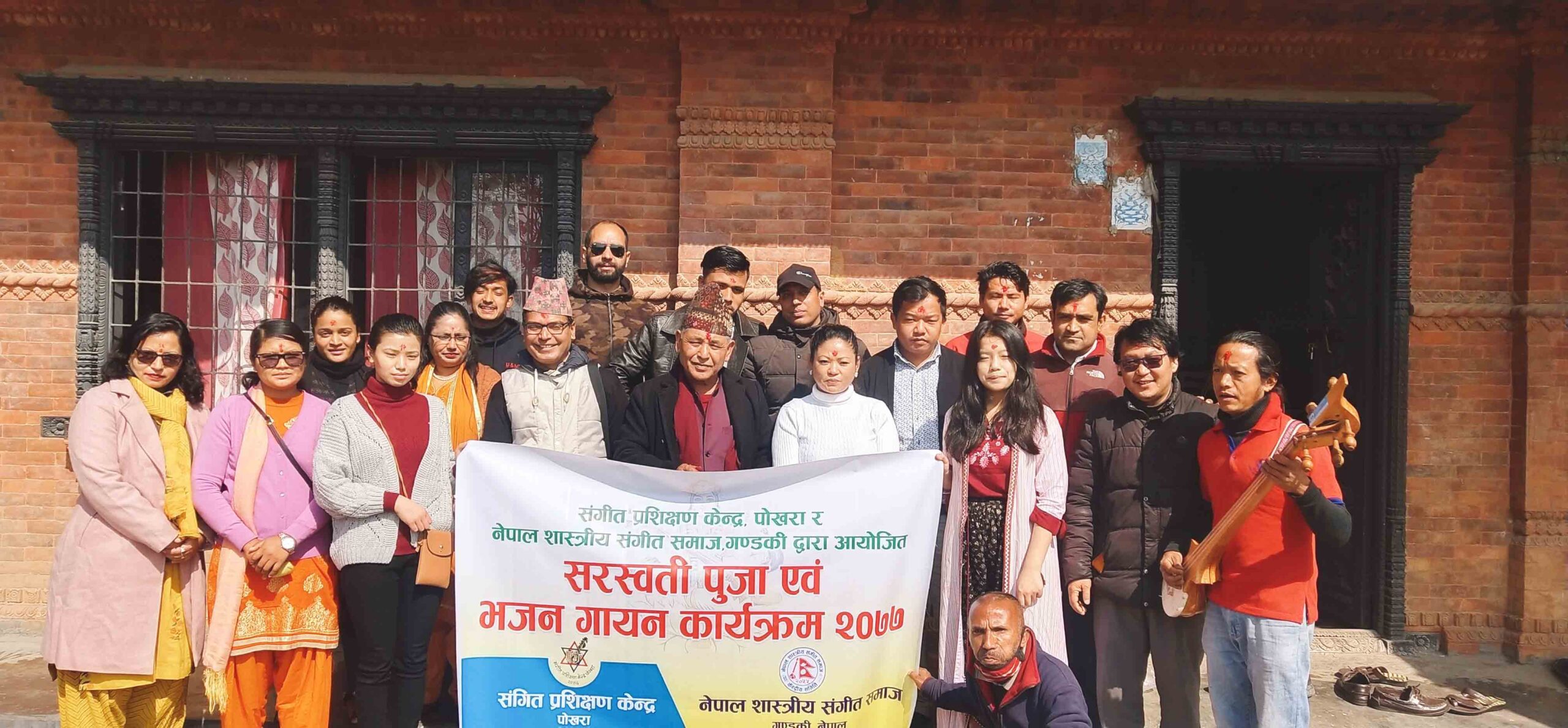 पोखरा, फागुन ४ गते । नेपाल शास्त्रीय संगीत समाज, गण्डकी प्रदेश र संगीत प्रशिक्षण केन्द्र, पोखराको संयुक्त आयोजनामा बसन्त पञ्चमीको अवसरमा “सरस्वती पुजा एवं भजन गायन २०७७” कार्यक्रम बिन्ध्यवासिनी स्थित संगीत प्रशिक्षण केन्द्रको सभाहलमा सम्पन्न भएको छ ।