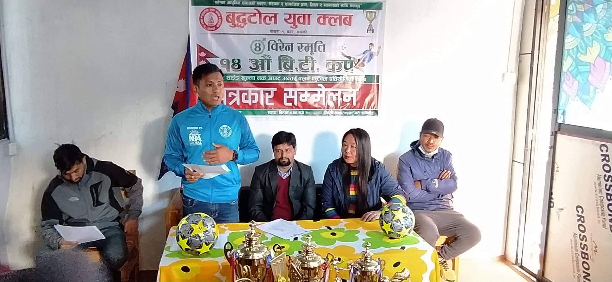 पोखरा, फागुन ८ गते । बुद्धटोल युवा क्लब बगरको आयोजनामा चौथो बिरेन स्मृति १४ औं बि.टी कप सेभेन ए साईड नकआउट अन्तर क्लब फुटबल प्रतियोगिता फागुन तेश्रो साताबाट हुने भएको छ । आयोजक क्लबले शनिबार पोखरामा पत्रकार सम्मेलनको आयोजना गरीं फागुन १६ देखि २२ गतेसम्म सञ्चालन हुने बृद्धटोल युवा क्लबका अध्यक्ष विजय गुरुङले जानकारी दिनुभयो ।