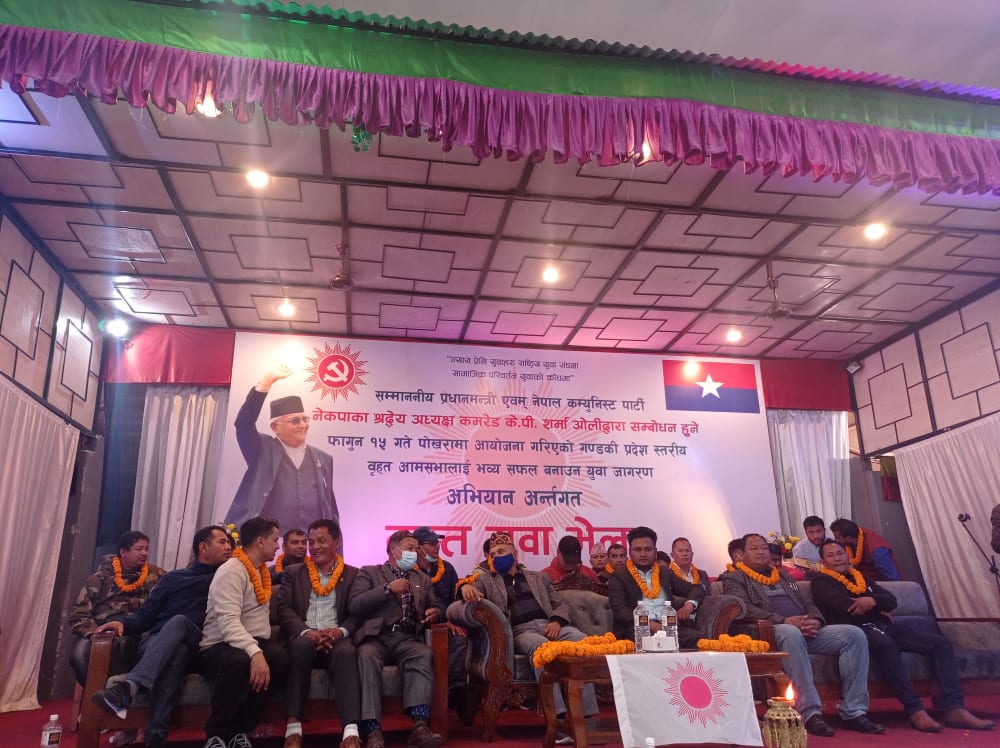 ‘प्रचण्ड झलनाथ र माधव नेपालले भुमि फिर्ता बारे केही बोलेनन् केही गरेनन् तर केपी ओलीको सरकार आएपछि च्यातिएको देश जोड्छु र भुमि फर्काउँछु भनेर नक्सा प्रकाशन गर्यो’,उनले भने,‘कालापानी लिपुलेक लिम्पियाधुराबाट भारतिय फौज हटाउछु भन्ने केपी ओलीलाई युवाले साथ दिनुपर्छ’ । देशलाई एकताबद्ध बनाउनका लागी पार्टी एकता जोगाउन आवश्यक रहेको उनले बताए । नेकपा केन्द्रिय सदस्य तथा कास्की अध्यक्ष कृष्ण थापाले केपी फागुन १५ गते कास्कीले करिब ६० हजार जनता उतार्ने तयारी गरिरहेको भन्दै युवाहरुलाई तयारीमा जुट्न आग्रह गरे ।