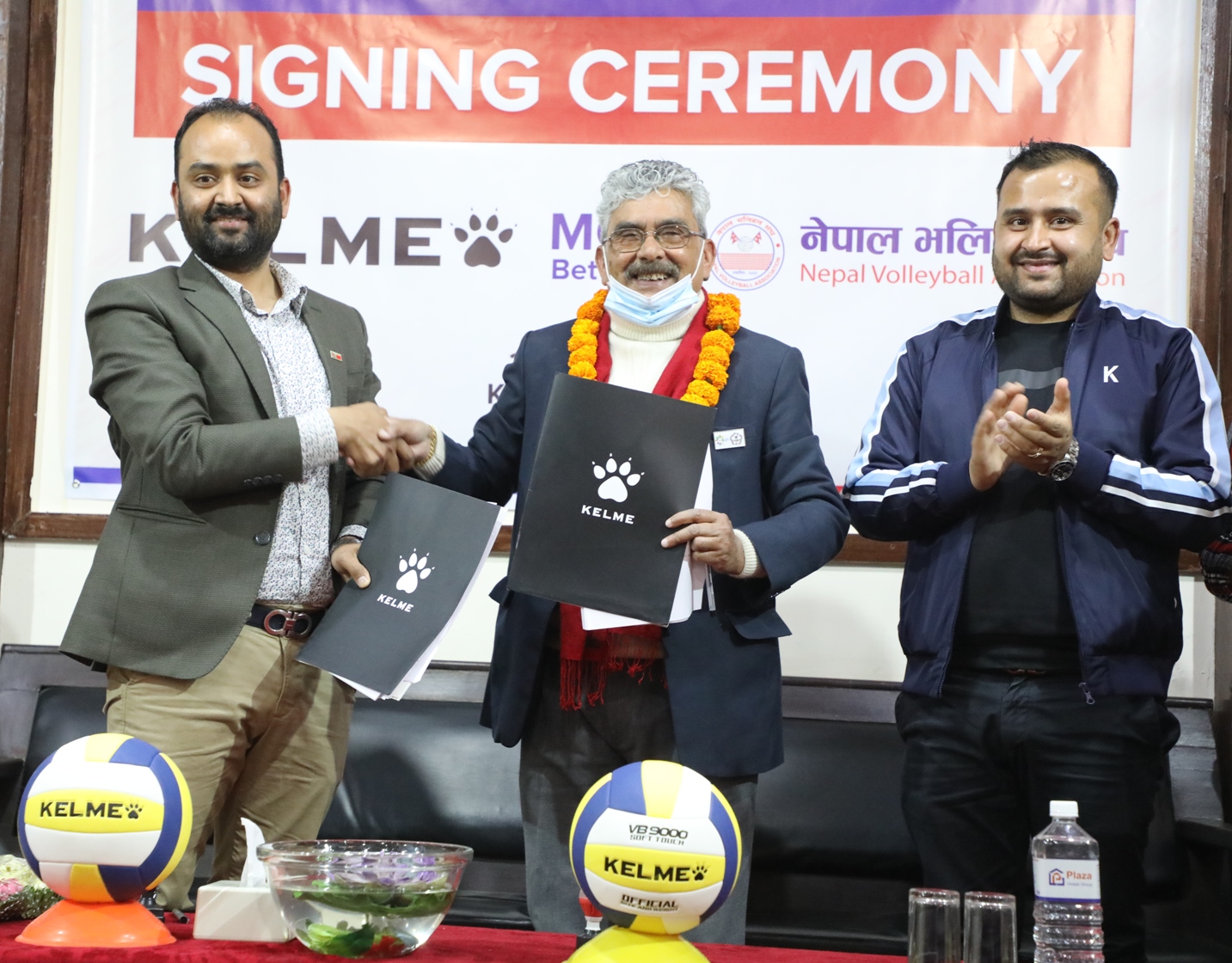 खेल सामाग्री उत्पादन संस्था केल्मे र नेपाल भलिबल संघविच सहकार्य गर्ने गरि सोमबार सम्झौता भएको छ । नेपालका लागि आधिकारीक विक्रेता केल्मे नेपालका तर्फबाट कन्ट्रि डाईरेक्टर प्रदीप न्यौपाने र नेपाल भलिबल संघका तर्फबाट अध्यक्ष मनोरञ्जन रमण शर्माले हस्ताक्षर सहित सम्झौता पत्र आदान प्रदान गरे ।