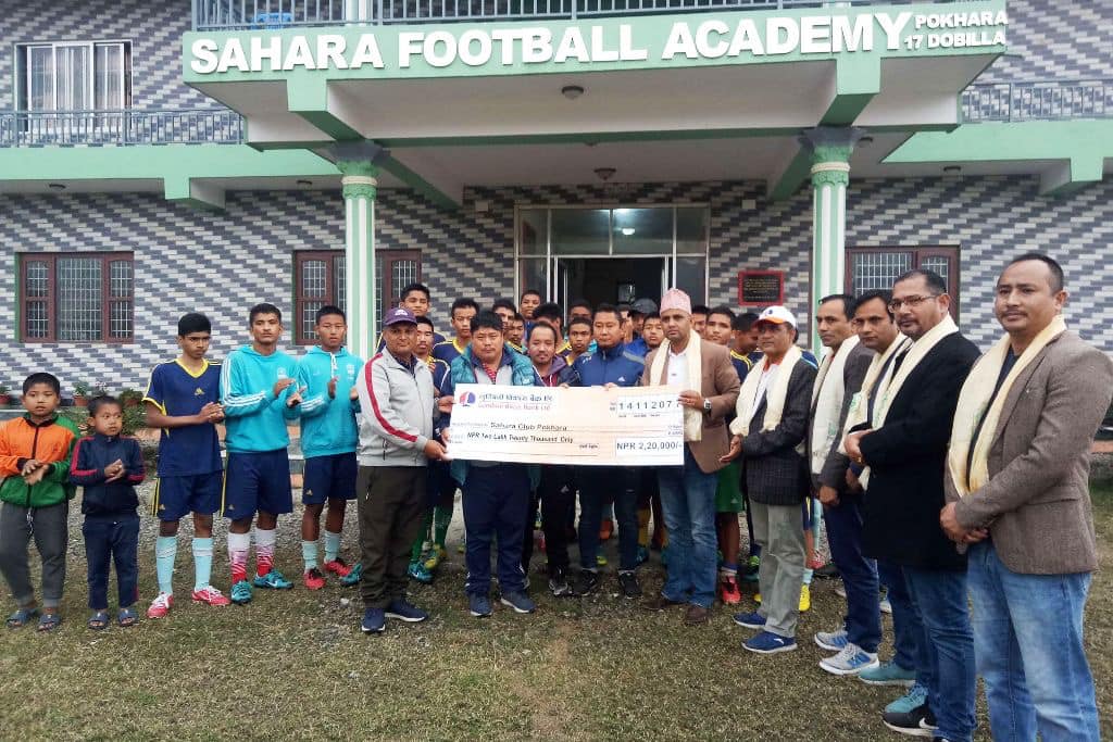 पोखरा, फागुन १४ /लुम्बिनी विकास बैंकले सहारा क्लवले सञ्चालन गरेको सहारा फुटबल एकेडेमीलाई २ लाख २० हजार रुपैया सहयोग गरेको छ । एकेडेमीमा रहेका २४ जना बालकहरुलाई एक वर्षका खाजाका लागि आवश्यक रकम बैंकले २ लाख २० हजार रुपैया सहयोग गरेको हो ।बैकका तर्फबाट सञ्चालक रामचन्द्र सिग्देल, बैंकका मुख्य प्रबन्धक दिपक खनाल, प्रमुख सञ्चालक सुकदेब पहारी, पोखरा रामबजार शाखाका प्रवन्धक बालकृष्ण बन, न्यूरोड शाखाका शाखा प्रबन्धक बलबहादुर ढकाल, लेखसाइड शाखा शाखा प्रबन्धक महेन्द्रकुमार श्रेष्ठ लगाएतले सहारा क्लबका अध्यक्ष केशब थापालाई चेक हस्तान्तरण गरेका छन् ।