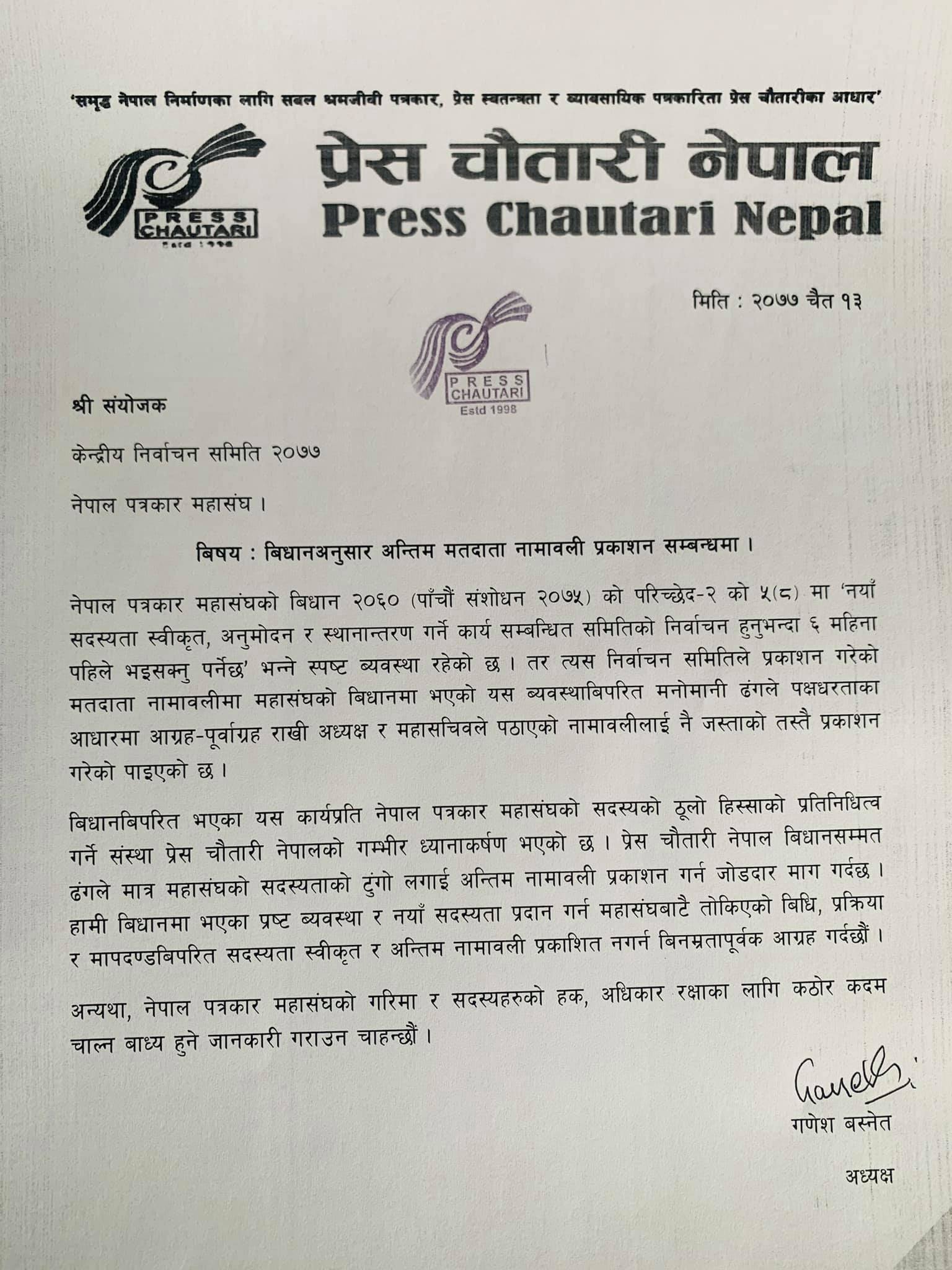 प्रेस चौतारीका अध्यक्ष गणेश बस्नेतले महासंघको विनधान २०६०(पाँचौ संशोधन२०७५)को परिच्छेद २ को ५(८) मा नयाँ सदस्यता स्वीकृत अनुमोदन र स्थानान्तरण गर्ने कार्य सम्वन्धित समितिको निर्वाचन हुनुभन्दा ६ महिना पहिलो भइसक्नुपर्ने छ भन्ने व्यवस्था रहेको उल्लेख गदै तर त्यस निर्वाचन समितिले प्रकाशन गरेको मतदाता नामावलीमा महासंघको विधानमा भएको व्यवस्था विपरित मनोमानी ढगले पक्षधरताका आधारमा आग्रह पूर्वाग्रह राखी अध्यक्ष र महासचिवलेपठाएको नामावलीलाई नै जस्ताको तस्तै प्रकाशन गरेको पाइएको अध्यक्ष बस्नेतले आरोप लगाएका छन् ।