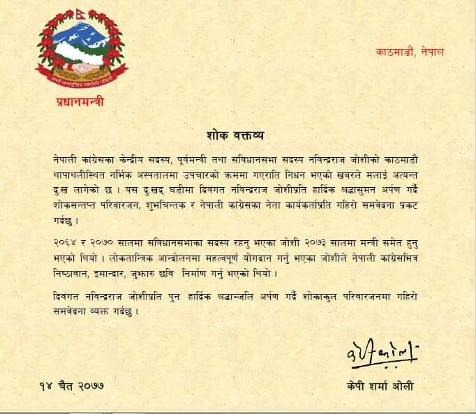 जोशीको काठमाडौं थापाथलीस्थित नर्भिक अस्पतालमा उपचारको क्रममा गएराति निधन भएको खबरले मलाई अत्यन्त दुःख लागेको छ । यस दुःखद् घडीमा दिवंगत नविन्द्रराज जोशीप्रति हार्दिक श्रद्धासुमन अर्पण गर्दै शोकसन्तप्त परिवारजन, शुभचिन्तक र नेपाली कांग्रेसका नेता कार्यकर्ताप्रति गहिरो समवेदना प्रकट गर्दछु प्रधानमन्त्री जारी गरेको शोक बक्तब्यमा भनिएको छ ।