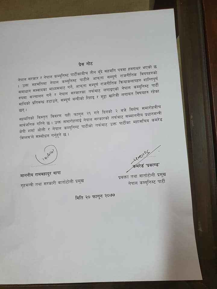 नेपाल सरकार र विप्लवले नेतृत्व गरेको नेपाल कम्युनिष्ट पार्टीबीच ३ बुँदे सहमति भएको छ ।