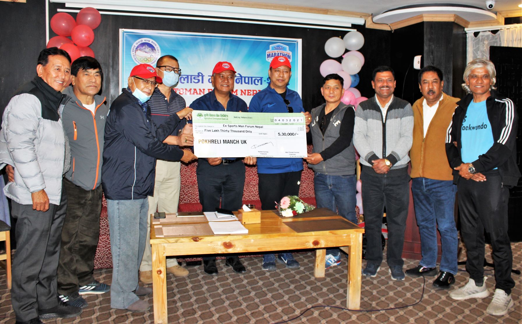 पोखरामा आयोजित एक पत्रकार सम्मेलन मार्फत पोखरेली मञ्च यूकेका कोषाध्यक्ष एवम समाजसेवी कमल गुरुङले ५ लाख ३० हजारको चेक भूतपूर्व खेलाडी मञ्च नेपालका अध्यक्ष तेज गुरुङलाई हस्तान्तरण गर्नुभयो ।