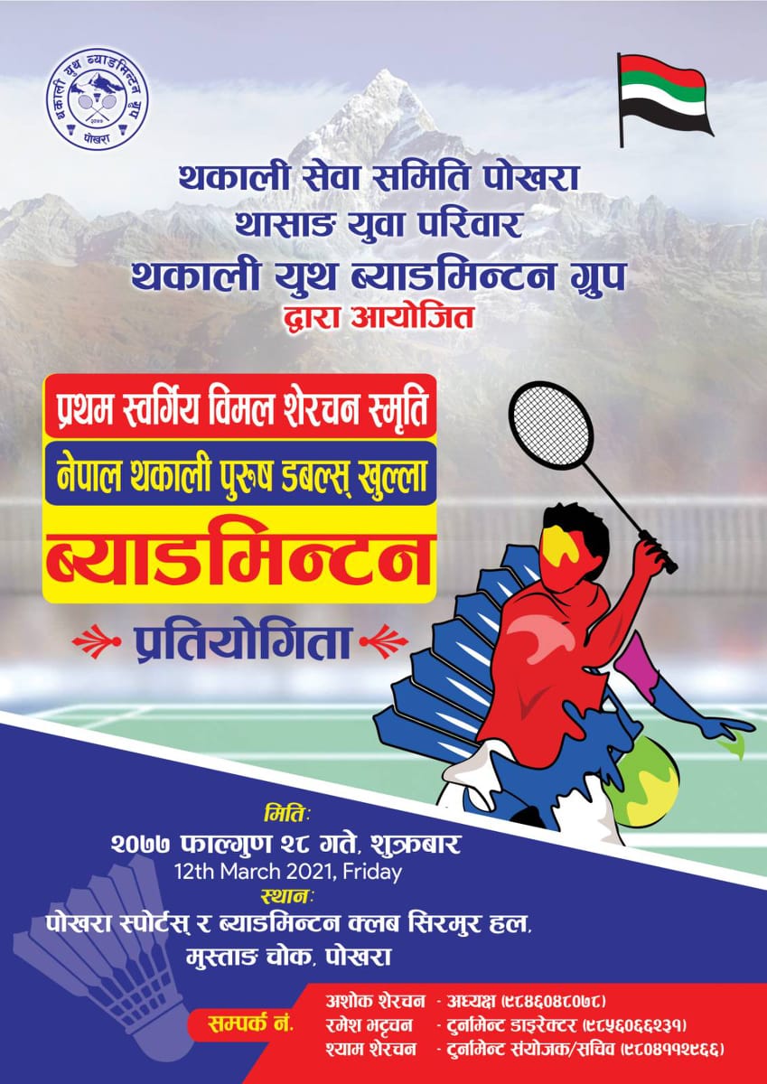 पोखरा, फागुन २१ गते ।प्रथम विमल शेरचन स्मृति नेपाल थकाली पुरुष डबल्स् खुल्ला व्याडमिन्टन प्रतियोगिता यही फागुन २८ गते पोखरामा हुने भएको छ । थकाली सेवा समिति पोखरा थासाङ युवा परिवारको थकाली युथ व्याडमिन्टन ग्रुपको आयोजनामा फागुन २८ गते शुक्रबार पोखरा स्पोर्टस र व्याडमिन्टन क्लव सिरमुर हल मुस्ताङ चोक, पोखरामा उत्त प्रतियोगिता हुने भएको ग्रुपका सचिव एवं प्रतियोगिता संयोजक श्याँम शेरचन (सोल्टी) ले बताए ।