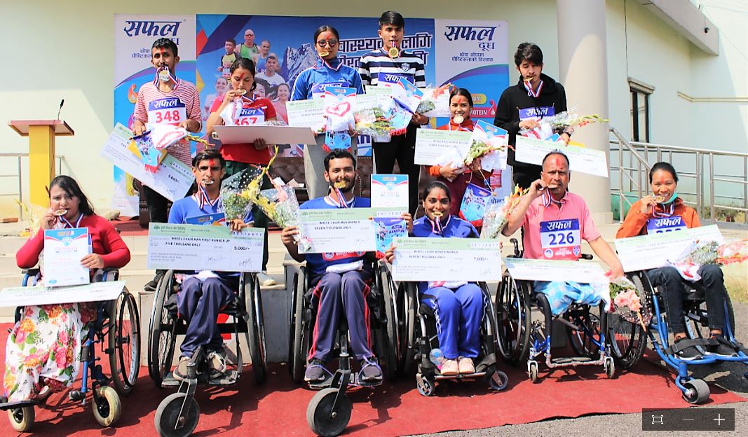 ह्विल चियर महिला दौडतर्फ अन्जु बराल प्रथम भइन भने प्रवित्रा विक दोस्रो र धना मगरले तेश्रो स्थान हात पारेकी छन । महिला ह्विल चियर दौडतर्फ विजेताले क्रमश नगद ७, ५ र ३ हजारका साथमा मेडल तथा प्रमाणपत्र हात पारे । यसै गरी दृष्टि विहिन पुरुष दौडतर्फको उपाधि सुनिल राना मगरले हात पारे । उनले उपाधि सँगै नगद ७ हजारका साथमा मेडल र प्रमाणपत्र प्राप्त गरेका छन । त्यसै गरी सोही स्पर्धामा प्रमोद दाहाल दोश्रो र प्रेम क्षेत्रीले तेश्रो स्थान हात पारे । उनीहरुले दुवैले क्रमश ५ हजार र ३ हजारका साथमा मेडल र प्रमाणपत्र गरे ।