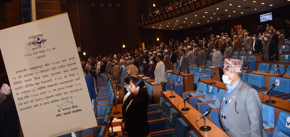 काठमाडौं, फागनु २३ गते । आजबाट शुरु भएको प्रतिनिधिसभाको बैठक १० मिनेटका लागि स्थिगित भएकोमा पछि बैठक सूचना टाँस गरेर स्थगित गरिएको ।अर्को बैठक फागुन २६ गते बुधबार दिनको १ः०० बजे बस्ने भएको छ ।