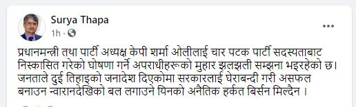 मंगलवार बिहानै फेसबुकमा स्ट्याटस लेख्दै थापाले ओलीलाई निष्काशनको घोषणा गर्नेहरूलाई ‘अपराधी’ को संज्ञा दिएका छन् ।