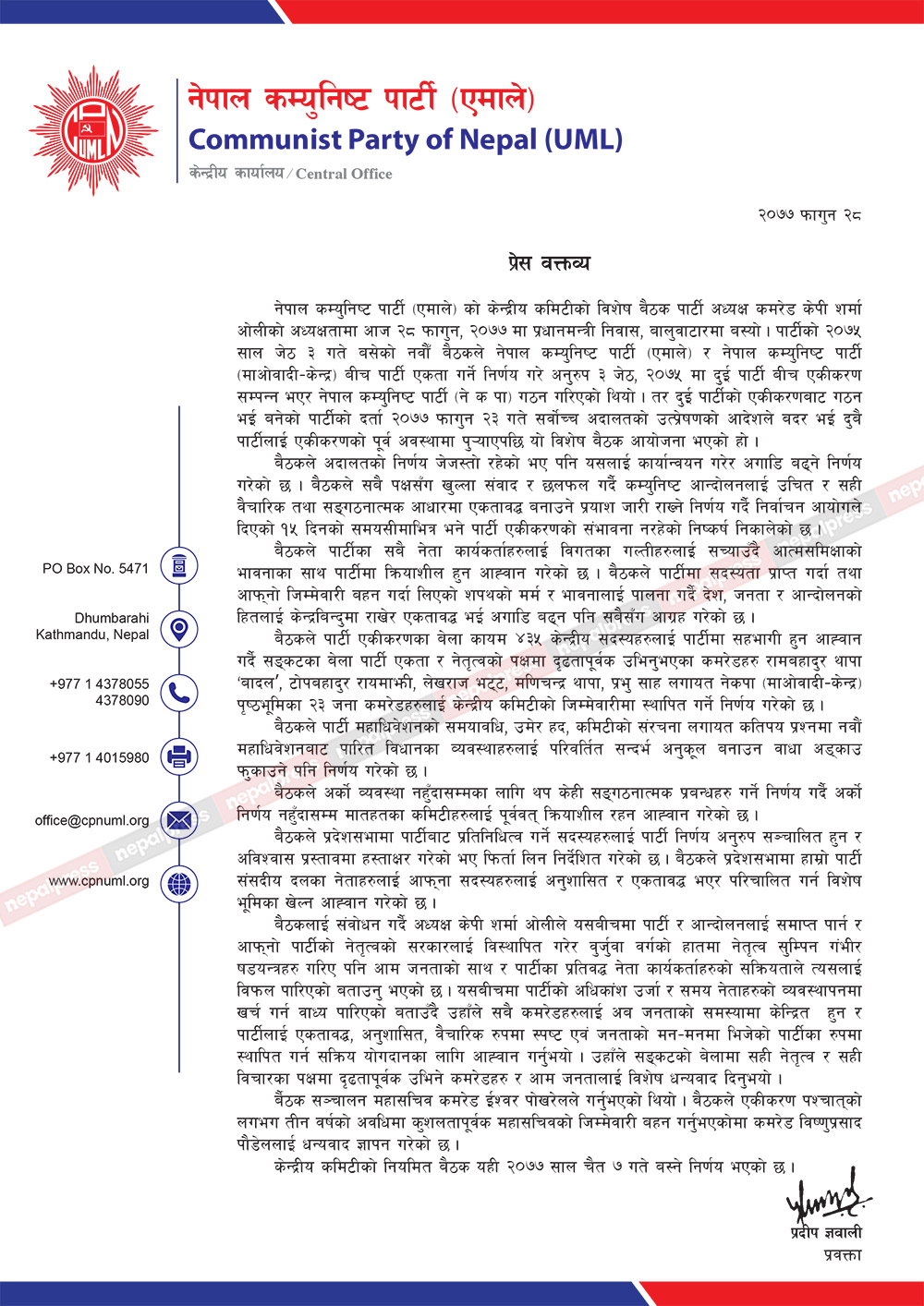 ज्ञवालीले बैठकपछि प्रेस विज्ञप्ति जारी गर्दै पार्टी एकीकरणका बेला कायम ४३५ सदस्यहरुलाई पार्टीमा सहभागी हुन आह्वान गरेको जनाएका छन् । त्यस्तै बैठकले महाधिवेशनको समयावधि, उमेर हदल, कमिटीको संरचना लगायतका कतिपय पश्नमा विधानका व्यवस्थाहरुलाई परिवर्तित सन्दर्भ अनुकुल बनाउन वाधा अड्काउ फुकाउने निर्णय गरेको विज्ञप्तिमा उल्लेख छ ।