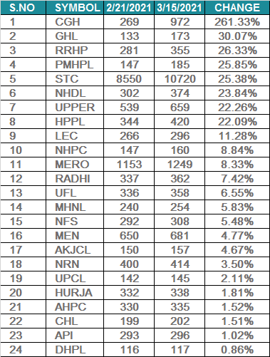 तर बजारमा यस्ता कम्पनीहरु पनि छन् जुन समग्र बजार घट्दा पनि लगातार उकालो लागिरहेका छन्। यस अवधिमा नयाँ सूचीकृत भएको चन्द्रागिरी हिल्सको शेयरमूल्य त साढे २०० प्रतिशतभन्दा पनि धेरैले बढेको छ। यस अवधिमा उसको शेयरमूल्य २६१.३३ प्रतिशतले बढेको हो।