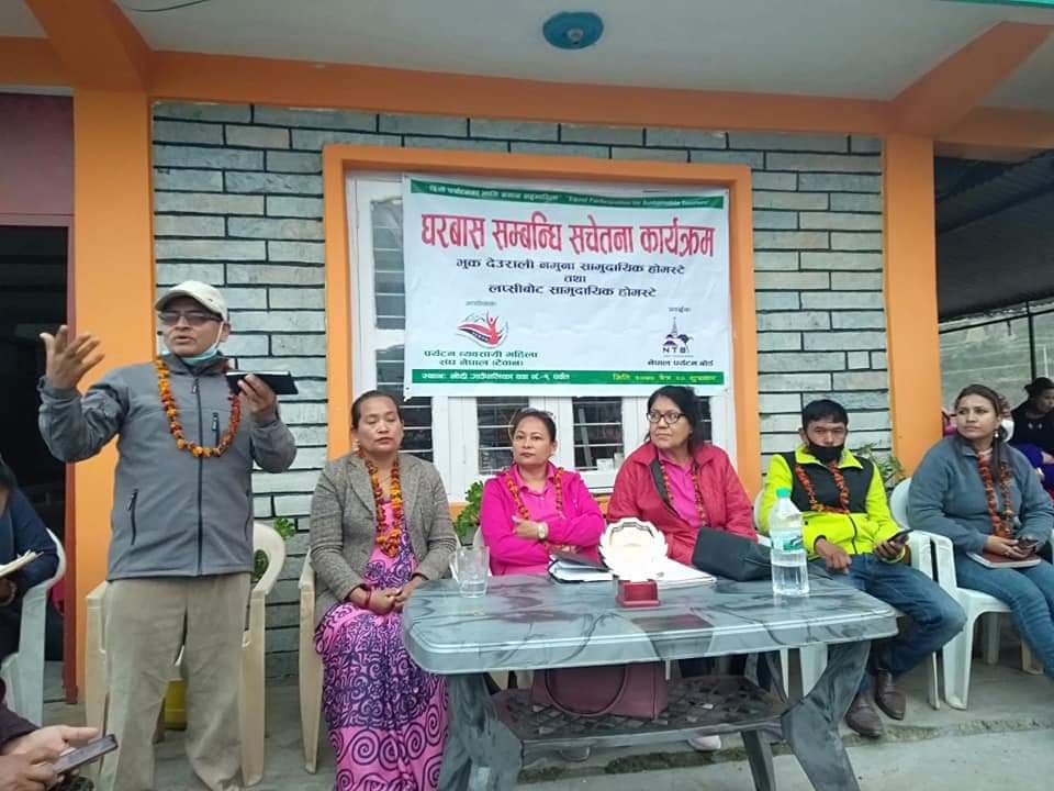पोखरा चैत २१ गते ।पर्यटन ब्यवसायी महिला संघ नेपाल (टेवान) को आयोजना तथा नेपाल पर्यटन बोर्डको प्रवर्दनमा मोदी गाउँपालिका वडा नम्वर ५ स्थित भुक देउराली नमुना सामुदायिक होमस्टे (घरवास) संचालकलाई सचेतना कार्यक्रम सम्पन्न भएको छ ।