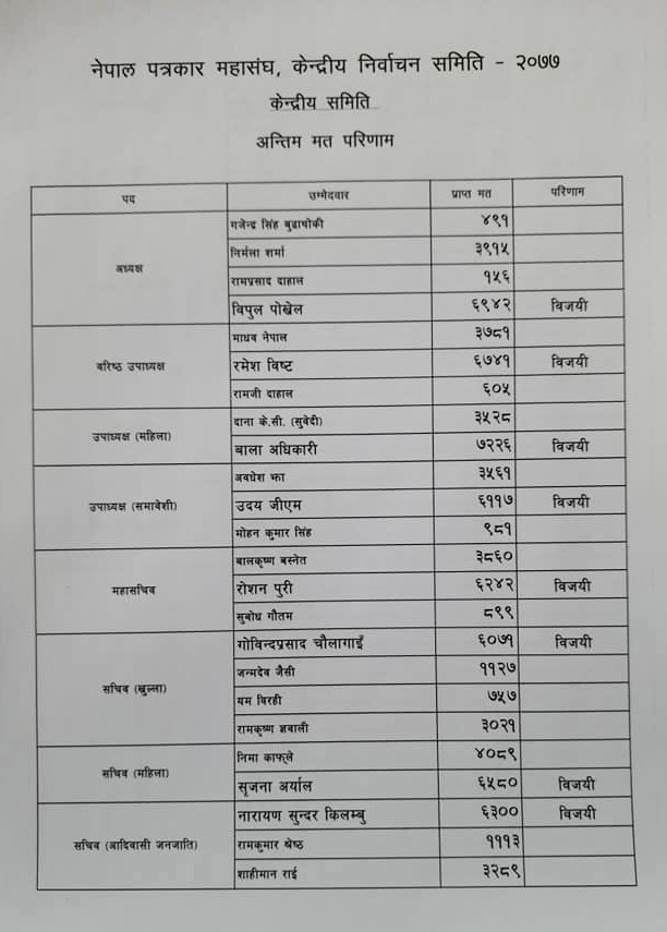 काठमाडौं । नेपाल पत्रकार महासंघको निर्वाचनको अन्तिम परिणाम सार्वजनिक भएको छ । निर्वाचन समितिका अनुसार महासंघको अध्यक्षमा प्रेस युनियन गठबन्धनका उम्मेदवार विपुल पोखरेल तीन हजार मतान्तरले पूरै प्यानलसहित निर्वाचित भएका छन् ।