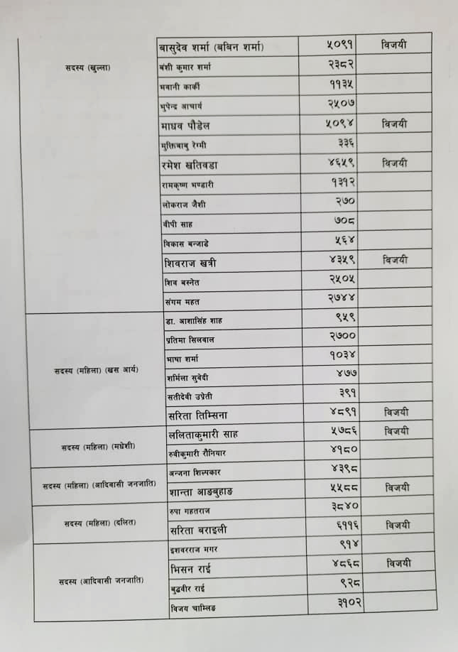 पोखरेलले ६ हजार ९४२ मत प्राप्त गरेका छन् । निकटतम प्रतिद्धन्द्धी प्रेस चौतारीकी उम्मेदवार निर्मला शर्माले ३ हजार ९१५ मत प्राप्त गरेकी छन् । अध्यक्षका अर्का प्रत्यासी गजेन्द्र बुढाथोकीले ६९१ मत प्राप्त गरेका छ