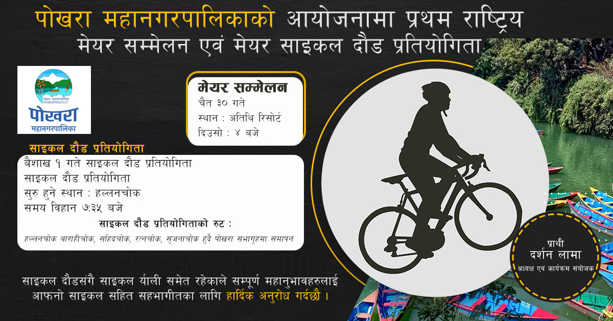 साईकल दौडमा स्थानीय तहका प्रमुखहरुले सहभागीता जनाउदै छन् । कास्की जिल्ला साइक्लिङ संघ, साइकल सिटी पोखरा र राष्ट्रिय तथा अन्तर्राष्ट्रिय खेलाडी संघसँगको सहकार्यमा ‘वातावरण जोगाऔं, स्वस्थ रहौं’ भन्ने नाराका साथ प्रतियोगिता आयोजना गरिएको हो । ‘स्थानीय तहका प्रमुखहरुले साईकल दौडमा प्रतिस्पर्धा गर्ने छन’ मेयर साईकल दौड प्रतियोगिताका संयोजक दर्शन लामाले भन्नुभयो